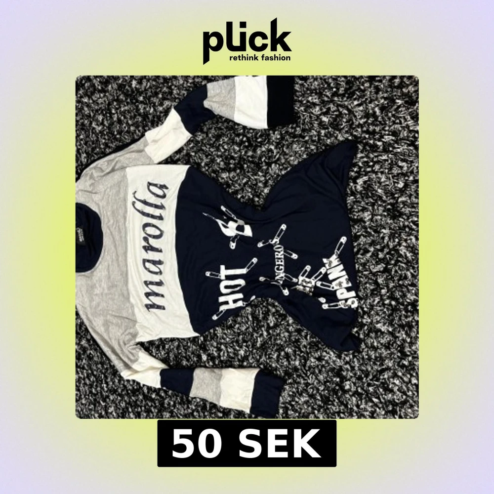 Säljer en långärmad tröja från Maroffa i blått, grått och vitt med tryck av säkerhetsnålar och texten 'HOT', 'SPANK', 'DANGEROUS'. Tröjan har blockfärgade ärmar och en cool streetstil.2000s vibe