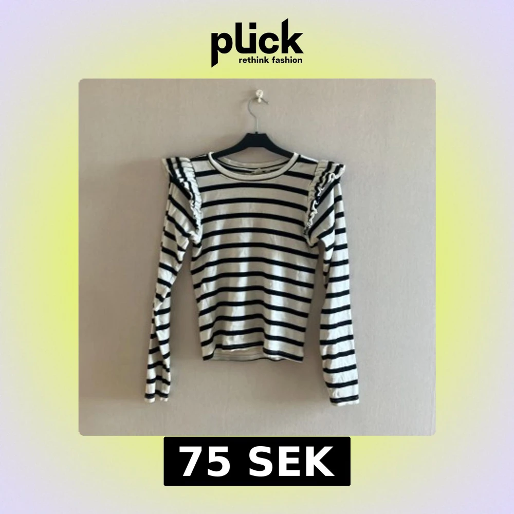 Snygg långärmad tröja med svartvita ränder och volangdetaljer på axlarna. Tröjan har en klassisk rund halsringning och är figurnära i modellen. Perfekt för dig som gillar en trendig och lekfull stil. Säljes pga av urväxt
