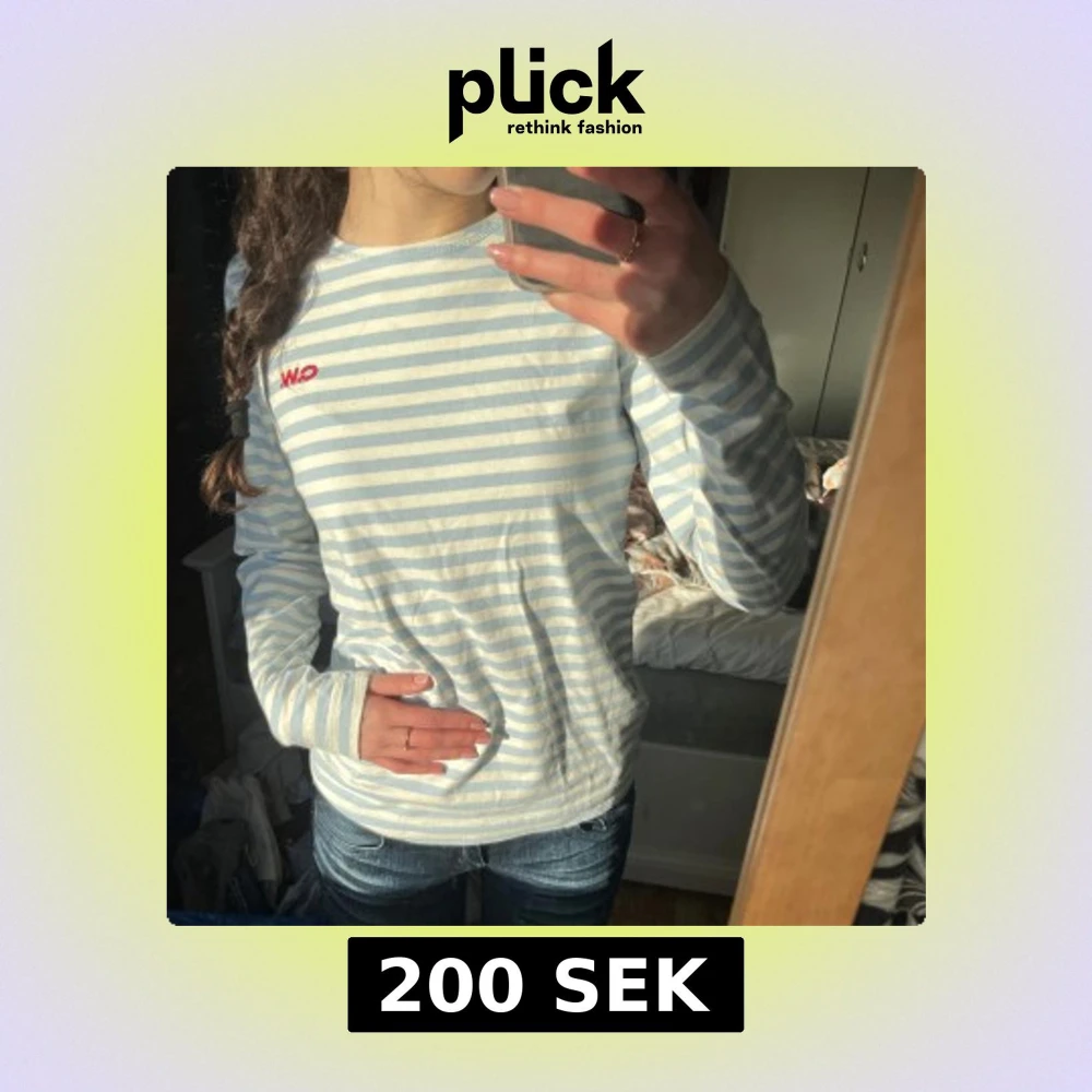 Säljer en stilren randig tröja i ljusblått och vitt med lång ärm. Knappt använd så topp skick