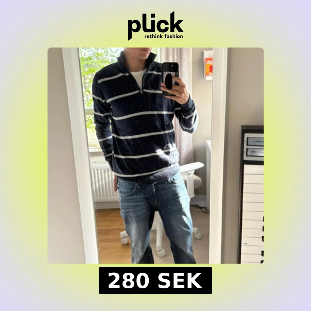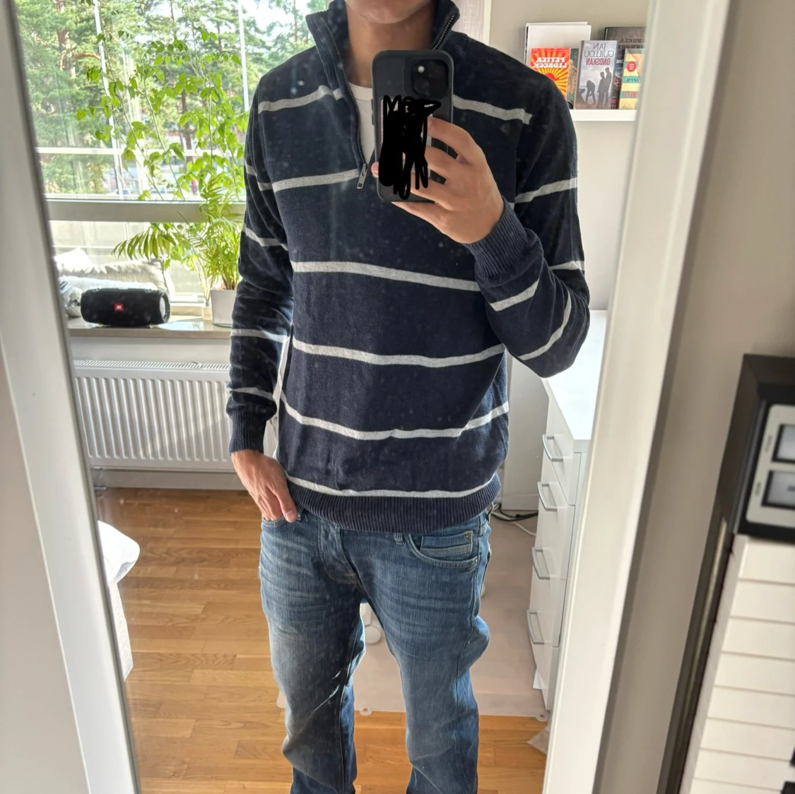 Säljer en marinblå tröja med vita horisontella ränder och half zip i halsen. Tröjan har hög krage, ribbade muddar och är långärmad. Perfekt för dig som gillar en avslappnad men ändå stilren look.