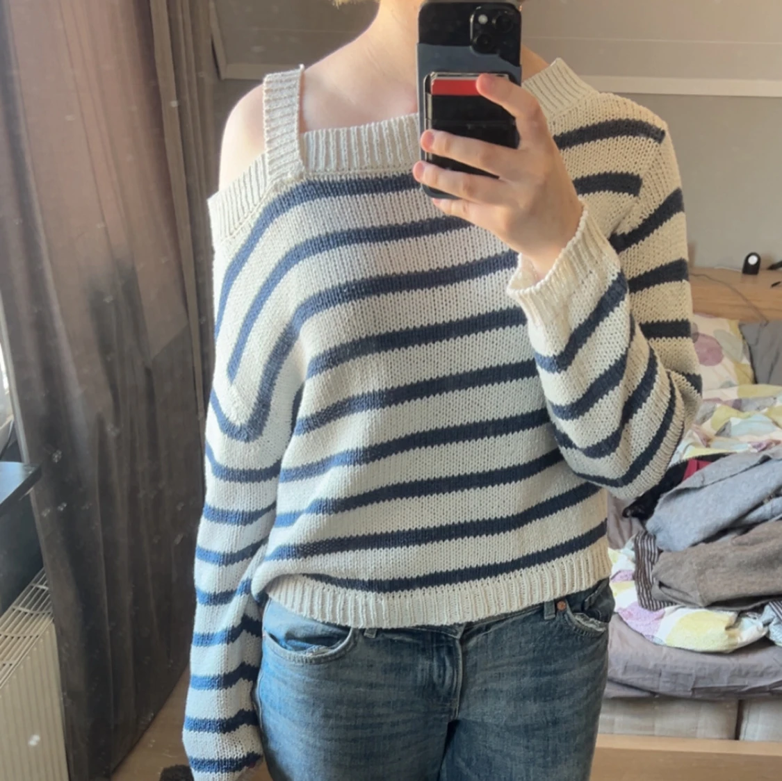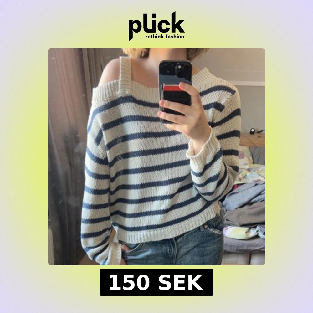 Säljer en stickad offshoulder tröja med breda blå och vita ränder. Tröjan har lång ärm och en croppad passform. Perfekt för dig som gillar en avslappnad men trendig stil.