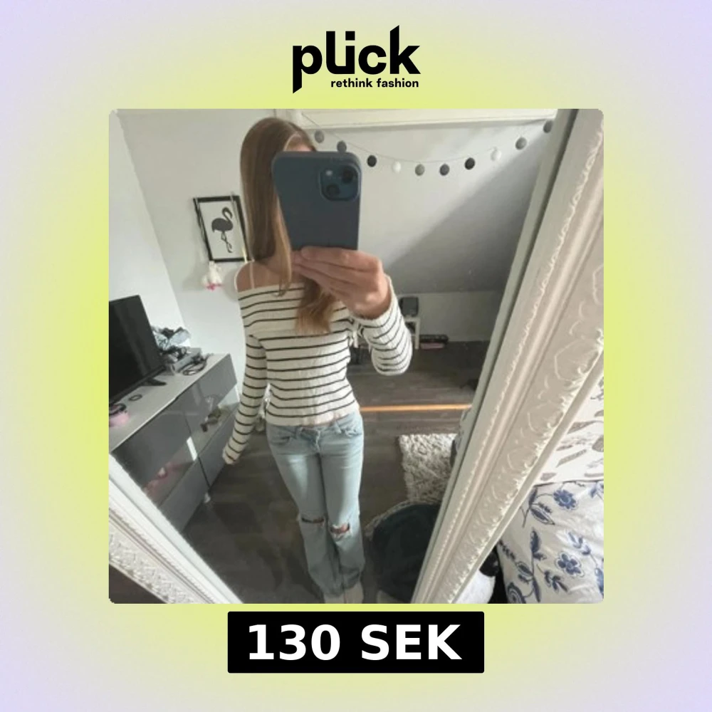 Supersnygg ribbad offshoulder tröja i vitt med svarta horisontella ränder. Tröjan är figurnära och har långa ärmar. Perfekt för dig som gillar en stilren och trendig look. Materialet känns mjukt och stretchigt, vilket gör den bekväm att bära. Knappt använd.
