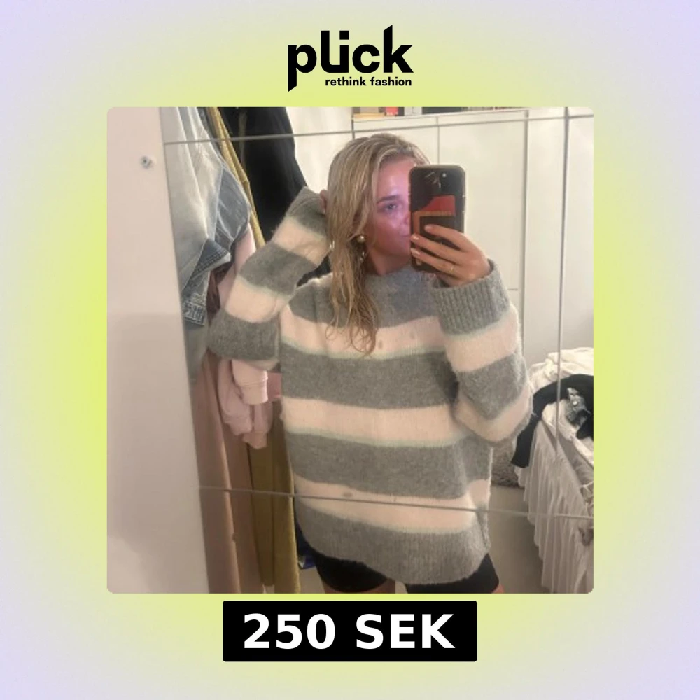 Supermysig stickad tröja med breda grå och vita ränder. Tröjan är oversized med långa ärmar. Jätte fint skick, endast använd 2 gånger! Från Gina i. S
