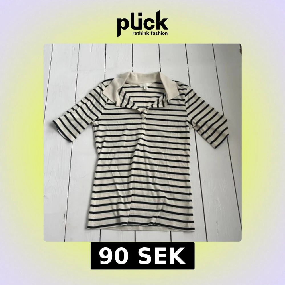 Randig pikétröja från H&M i storlek S. Tröjan är vit med svarta ränder, har krage och knäppning framtill. Man kan justera knapparna hur öppet man vill ha.