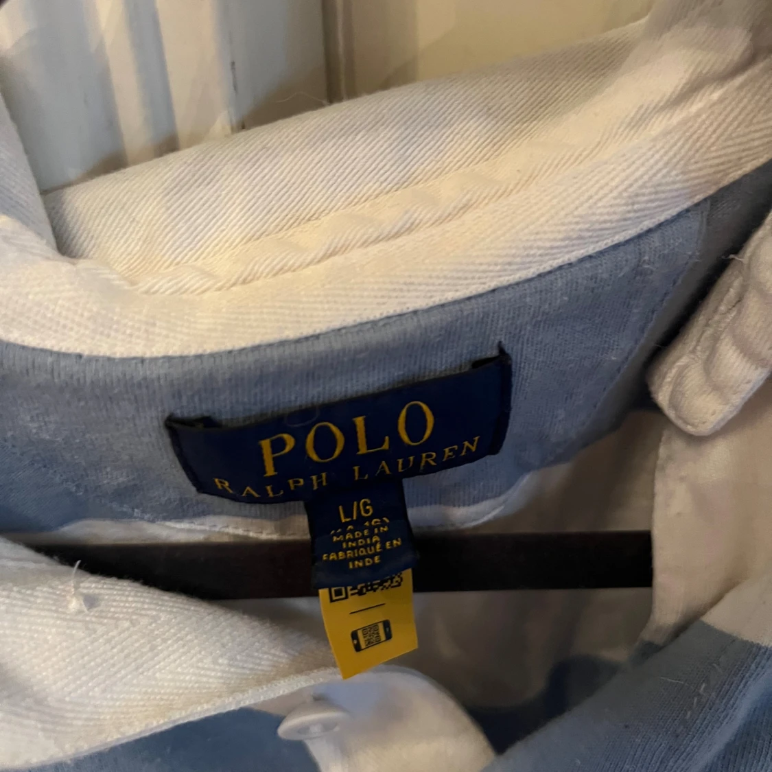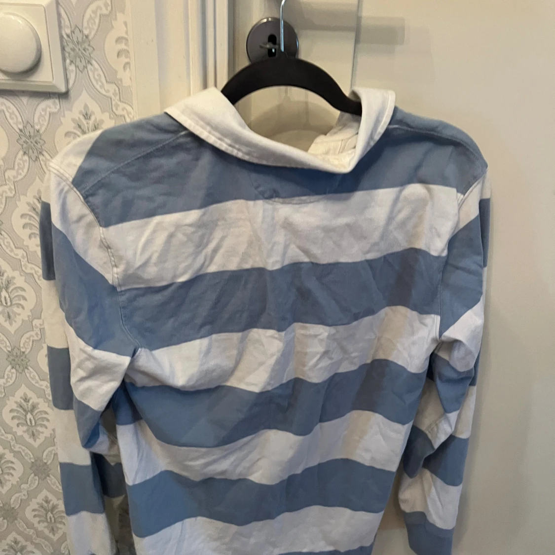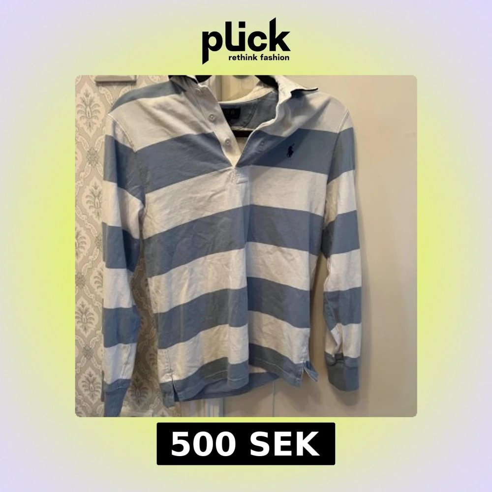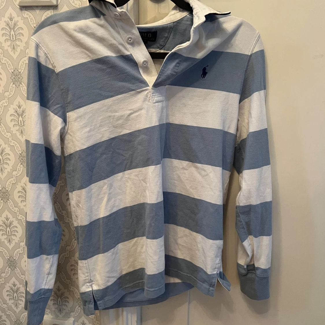 Säljer en klassisk långärmad pikétröja från Polo Ralph Lauren i blått och vitt med breda ränder. Tröjan har krage, knappar vid halsen och den ikoniska broderade loggan på bröstet. Perfekt för en preppy look! 14-16 år