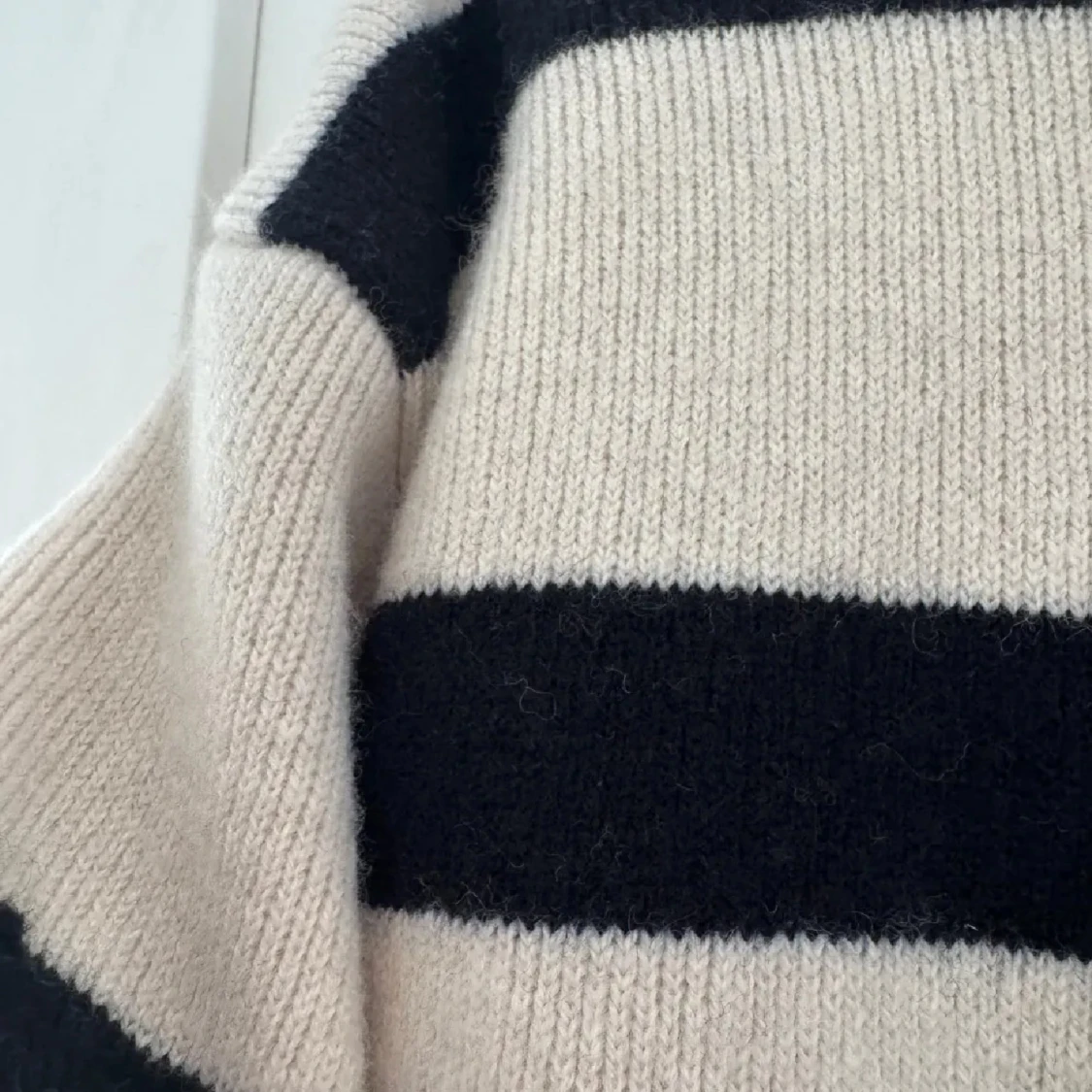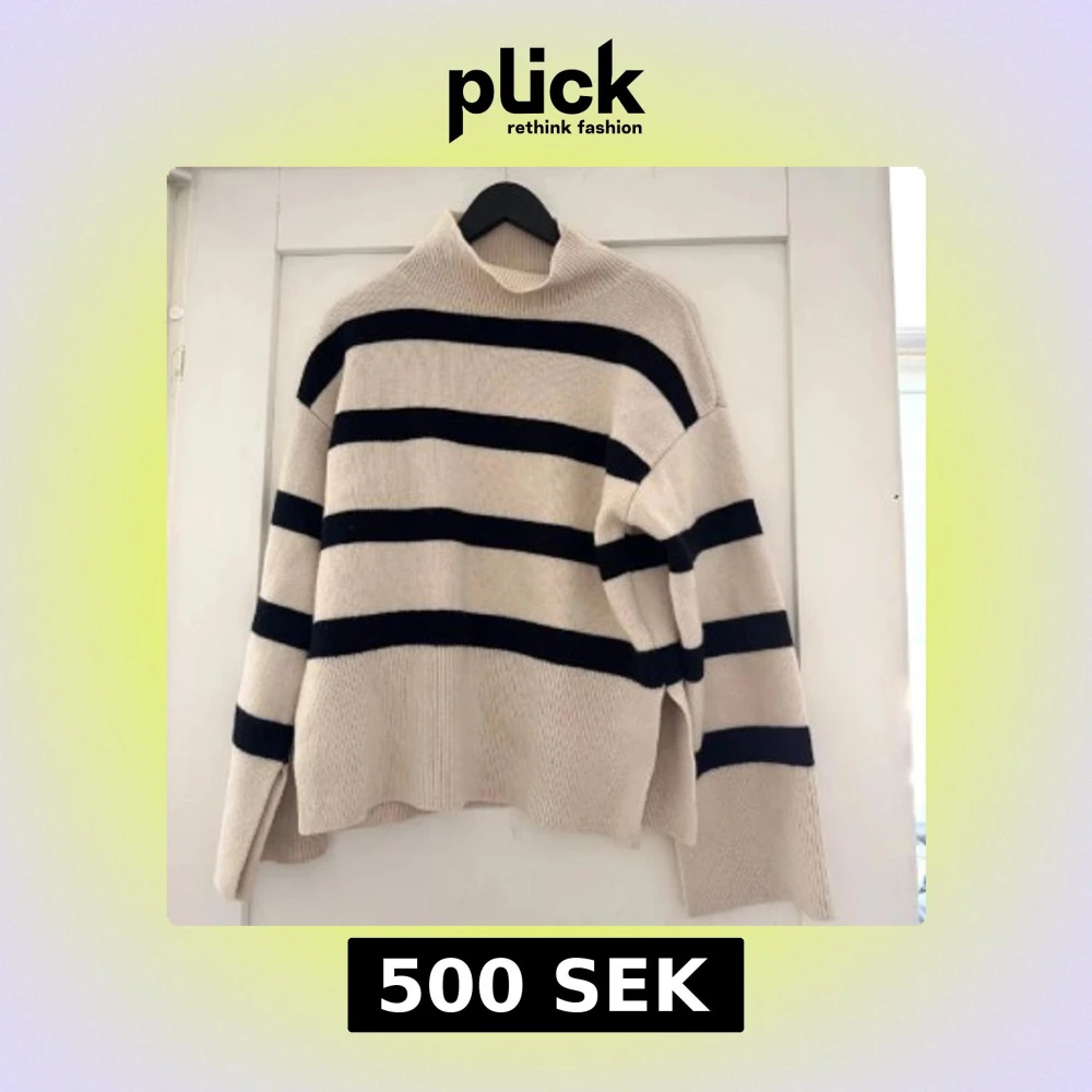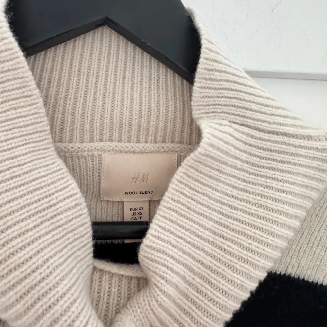 Säljer en beige och svart polotröja från H&M i deras premium kollektion i ullblandning. Tröjan har breda svarta ränder och hög krage. Nypris 899kr