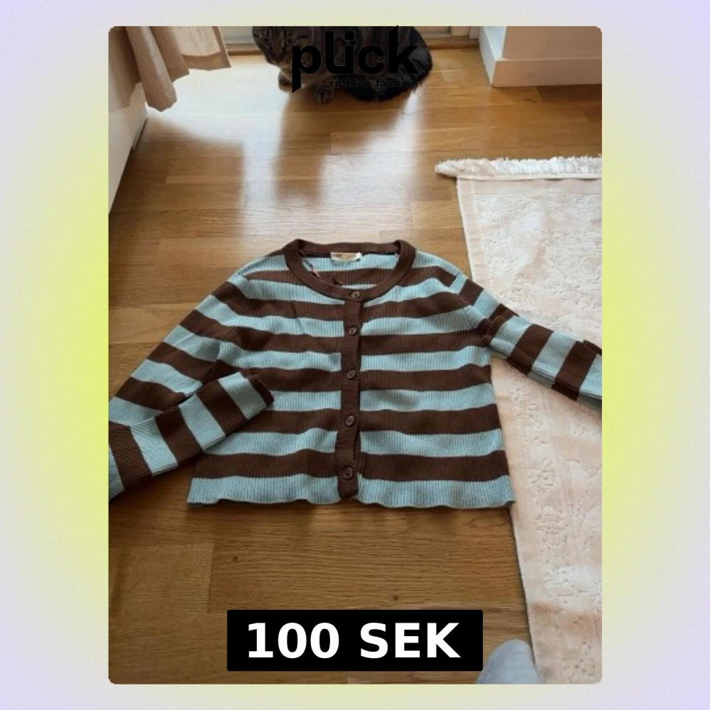 Snygg ribbstickad kofta med breda bruna och ljusblå ränder. Kortare modell med rund halsringning och knappar framtill. Perfekt för att addera lite färg till din outfit.