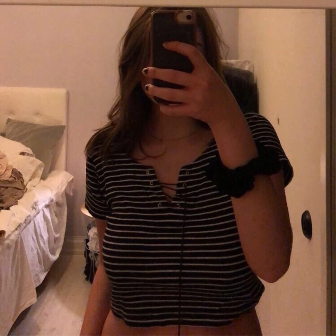Randig svartvit tröja från okänt märke! Snören som knyts. Jättesöt och ganska kort, men passar bra till low waist. Säljer pga förflyttning. Köparen står för frakt