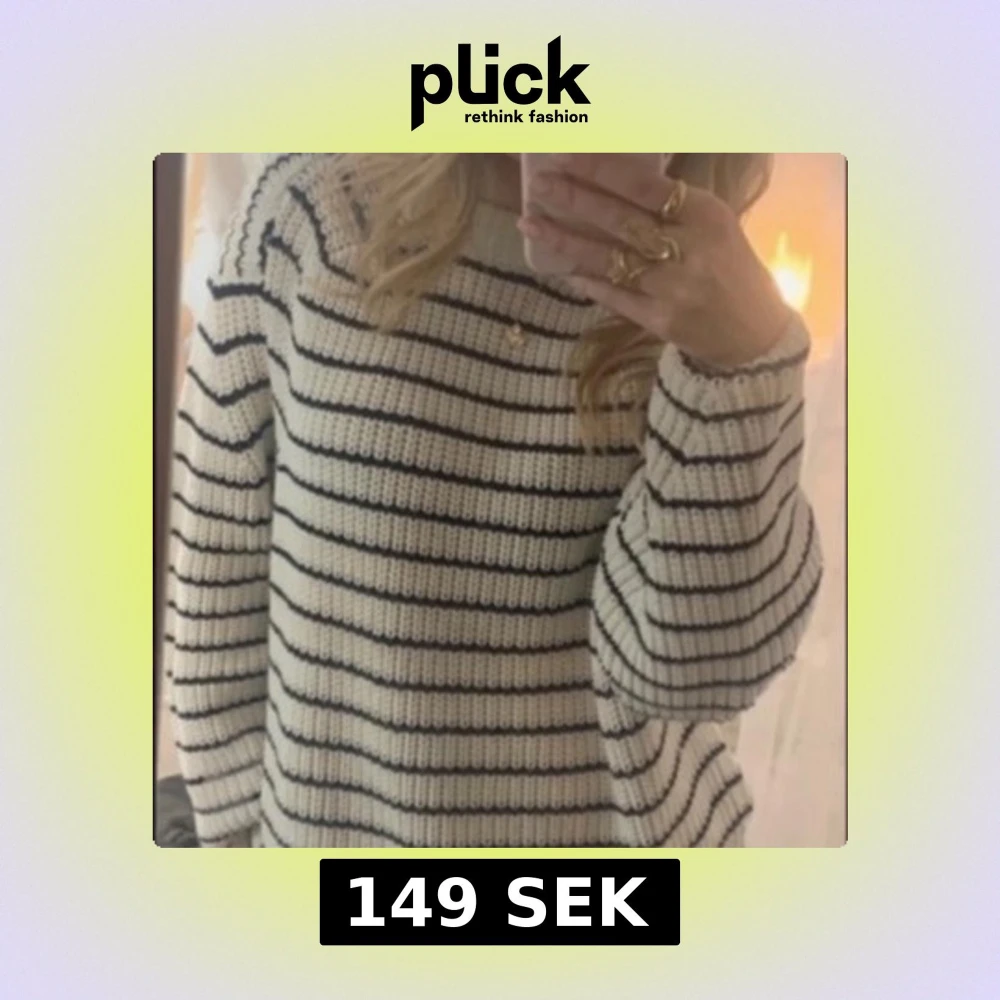 Säljer en mysig stickad tröja med svart och vit randigt mönster. Tröjan har långa ärmar och en rund halsringning. Perfekt för kyliga dagar!🩷🤗