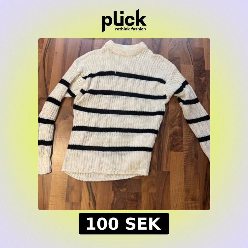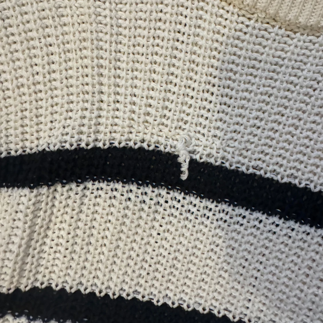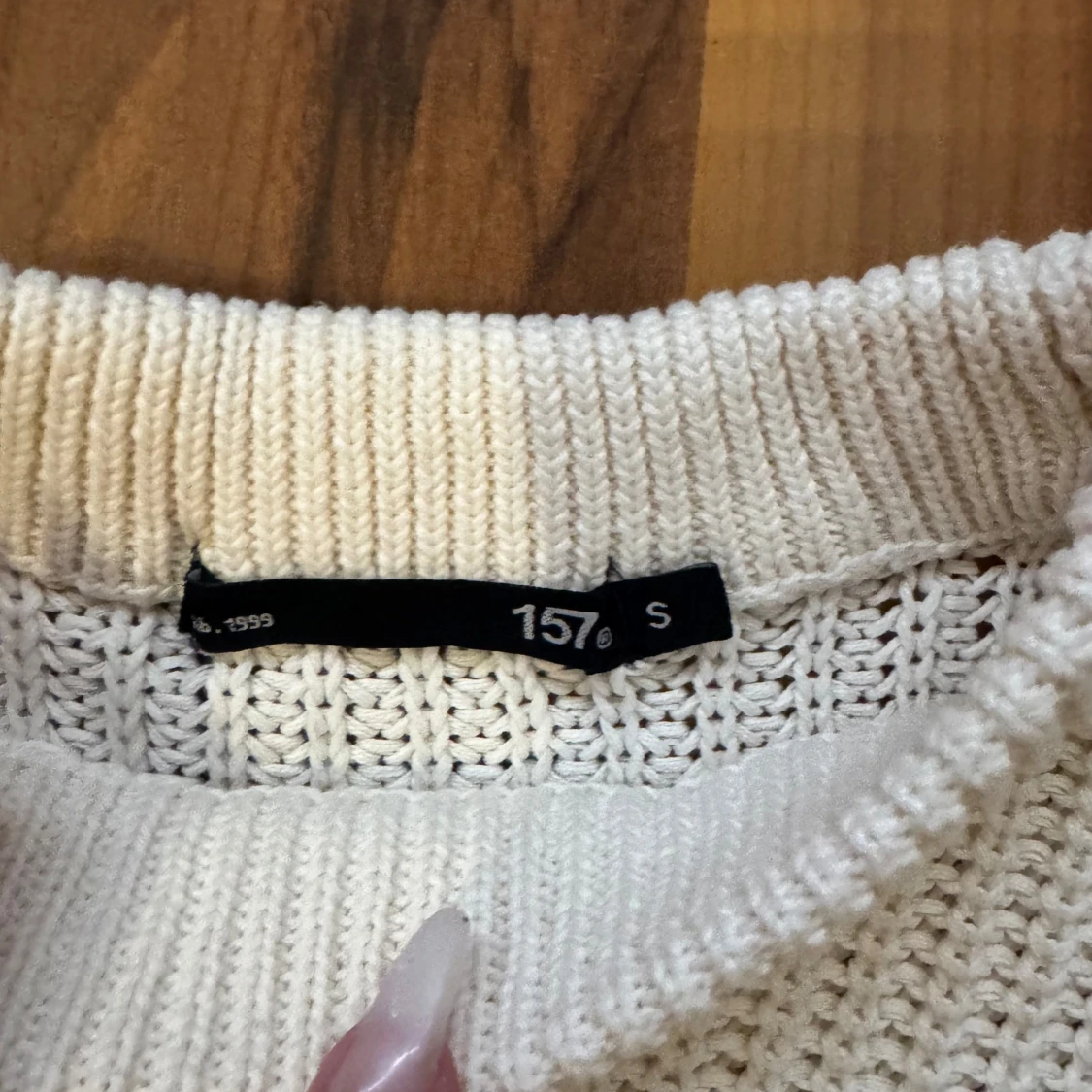Krämvit stickad tröja från 157 i storlek S med svarta horisontella ränder. Tröjan har en högre ribbad hals och långa ärmar. Den är grovstickad och har en avslappnad passform, perfekt för kyligare dagar.