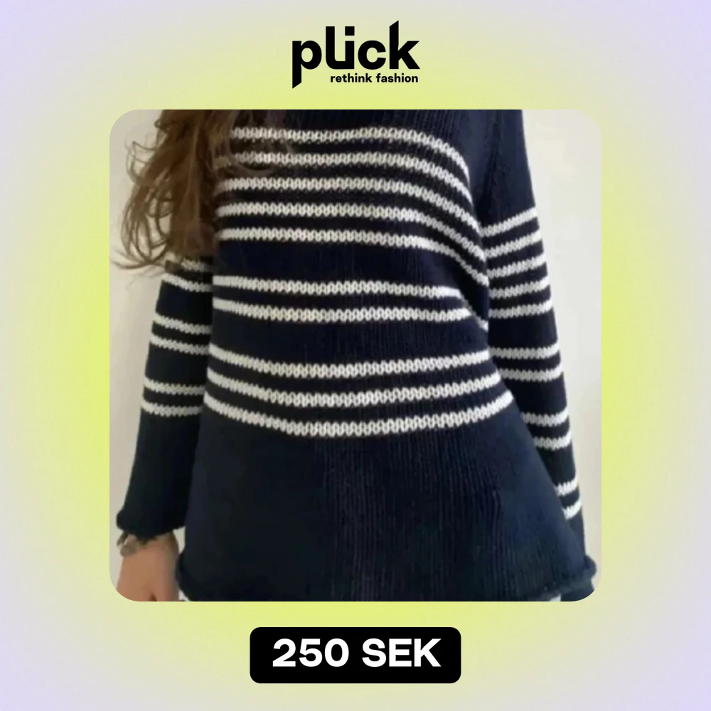 Säljer en supermysig stickad tröja i marinblått och vitt. Den har ett klassiskt randigt mönster och långa ärmar, perfekt för kyliga dagar💞
