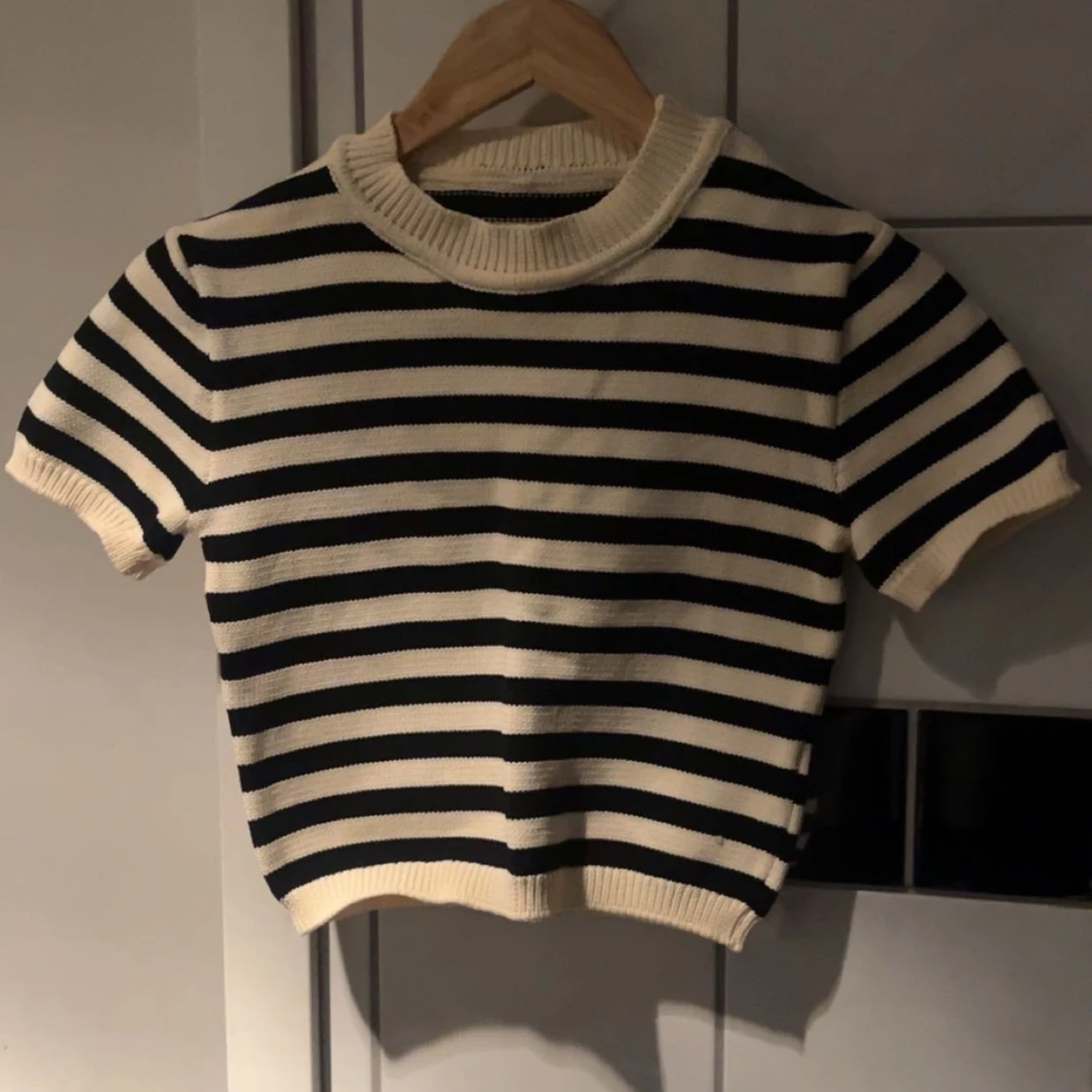 Säljer en snygg randig stickad tröja i svart och vit. Tröjan har korta ärmar och en rund halsringning. Passar bra till både jeans och kjol.