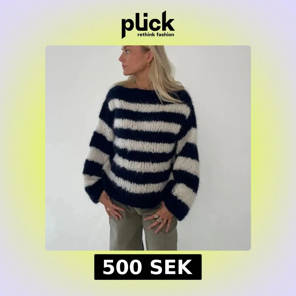 Supermysig stickad tröja från Design by Si med breda marinblå och vita ränder. Ordinarie pris är 1075 men jag säljer den för 500😊 Den är använd ett fåtal gånger och ser ut som när jag köpte den.