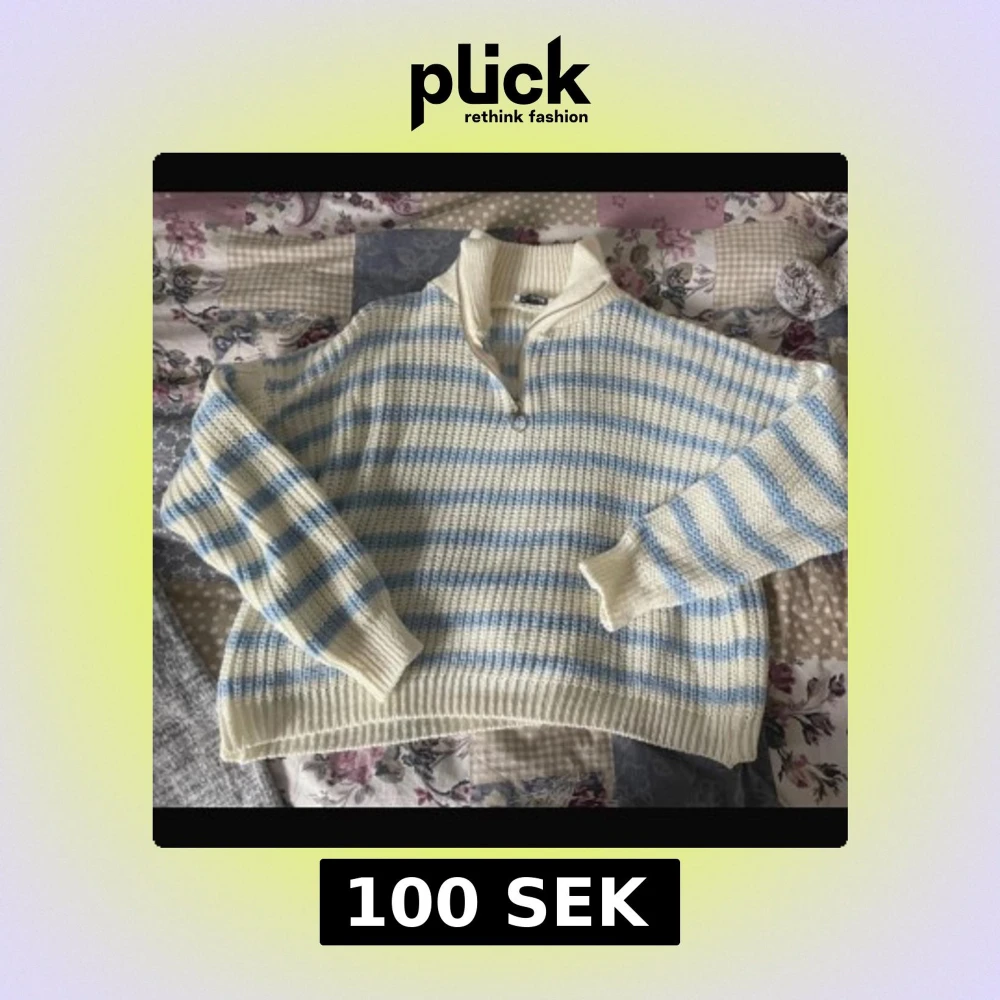 Supermysig stickad tröja från Design by Si i vitt och ljusblått randigt mönster. Tröjan har hög krage med half zip-dragkedja och långa ärmar. Perfekt för kyliga dagar och ger en chill vibe till din outfit. ganska kort och kragen är i ett tjockare material
