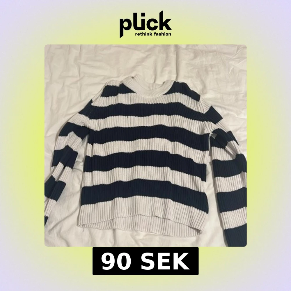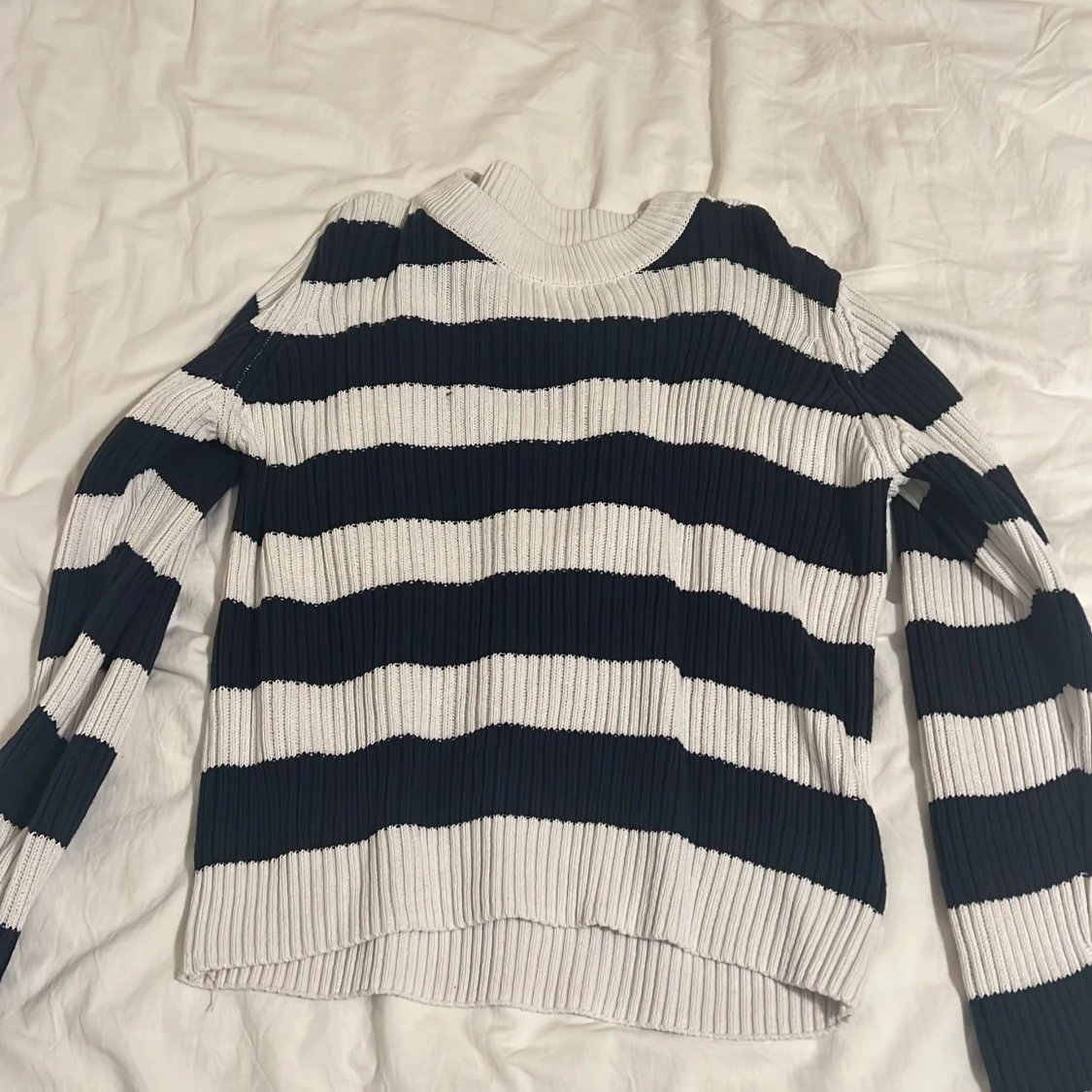 Säljer en snygg randig stickad tröja från 157 i svart och vit. Tröjan har långa ärmar och en bekväm passform, perfekt för kyligare dagar. Den ribbade strukturen ger en extra touch av stil.