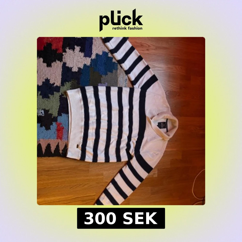 Säljer en vit och marinblå stickad tröja från Hampton Republic. Tröjan har breda horisontella ränder, lång ärm och ribbade muddar. Perfekt för en klassisk och avslappnad stil.