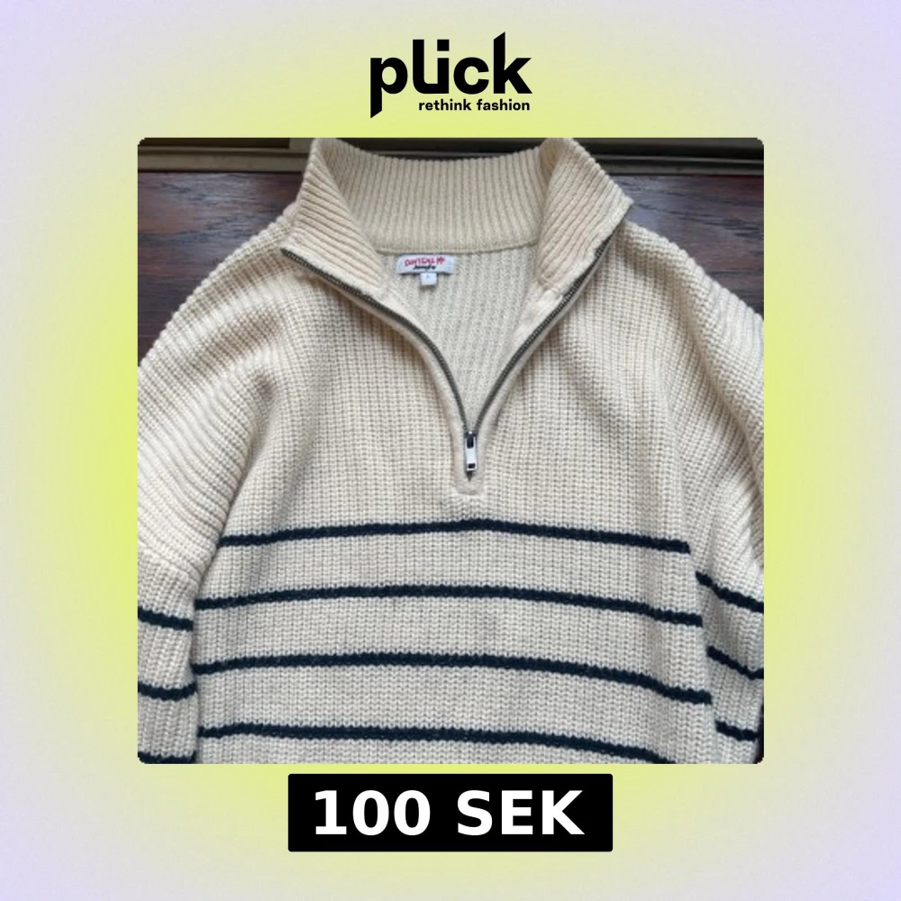 Beige stickad tröja från Jennyfer med svarta horisontella ränder. Tröjan har hög krage, half zip-dragkedja och långa ärmar. Perfekt för dig som gillar en chill och klassisk vibe. Materialet känns rejält och mysigt. Står L men sitter bra på XS-S-M