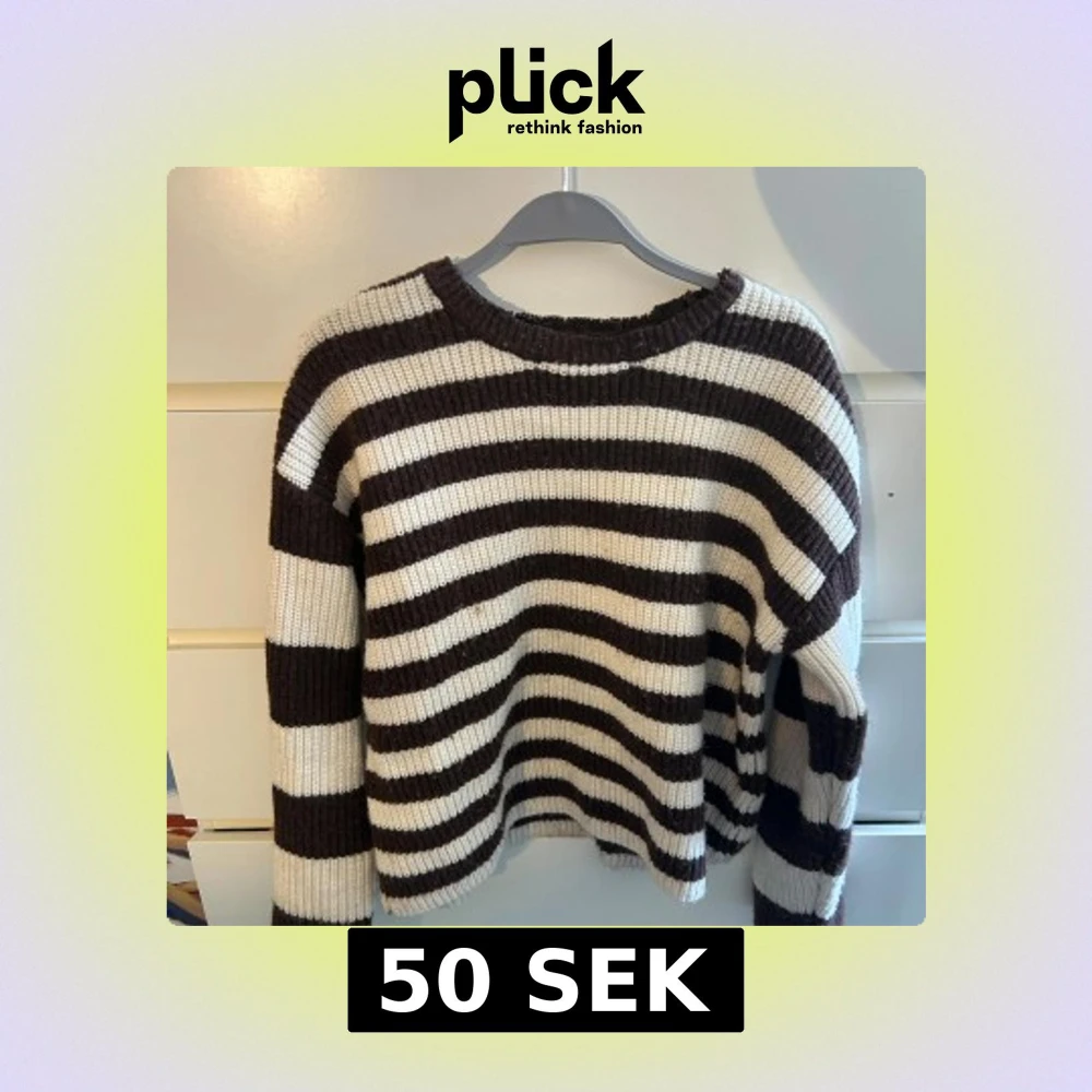 Supermysig stickad tröja från Monki i storlek S. Tröjan har breda bruna och vita ränder, rund halsringning och långa ärmar. Perfekt för lager-på-lager och chill dagar. Ribbstickad för extra komfort och stil. klippt i naken för att den var väldigt tajt