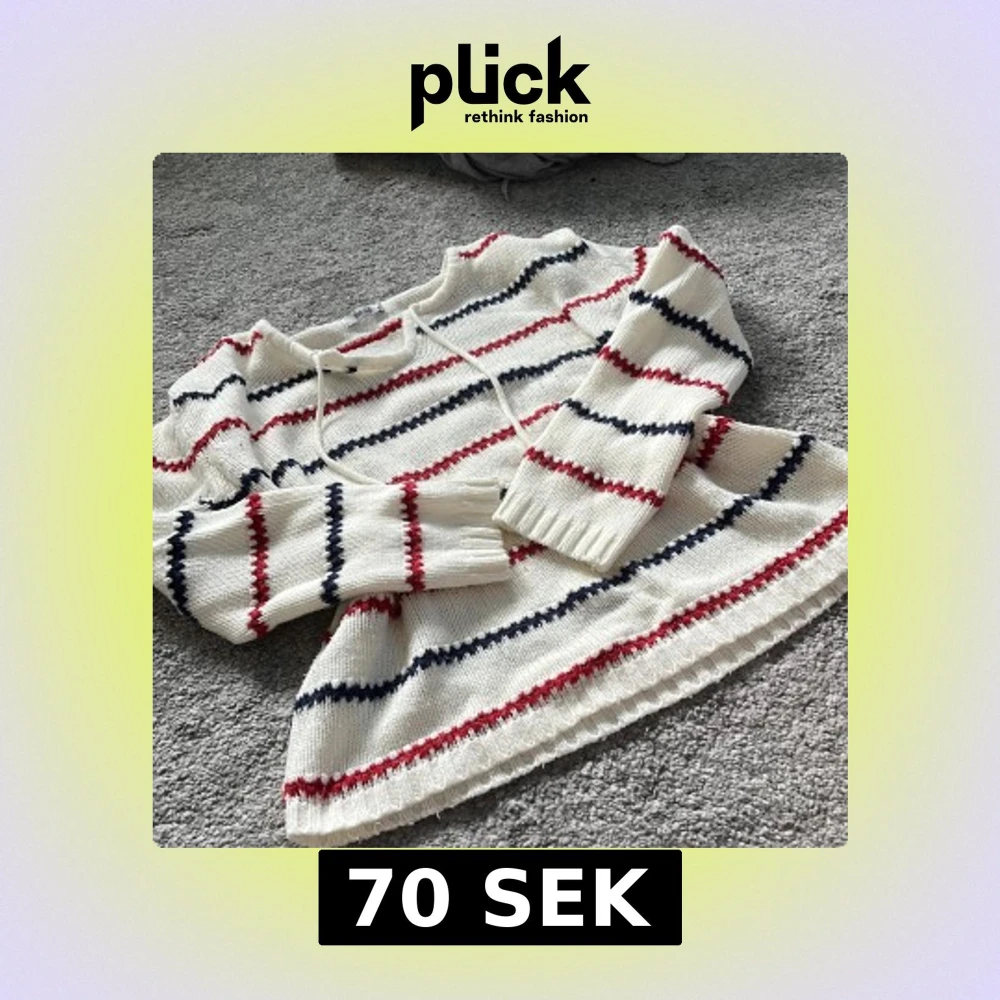 Vit stickad tröja från Rut m.fl. med röda och marinblå ränder. Tröjan har lång ärm, rund halsringning med snörning och ribbade muddar. Ger Pippi vibes om du gillar det🥰
