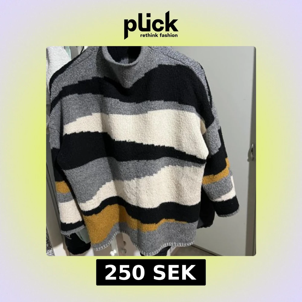 Säljer en mysig stickad tröja från Vila med ett randigt mönster i svart, grått, vitt och gult. Tröjan har en hög krage och långa ärmar, perfekt för kyliga dagar. Den är både stilren och bekväm.