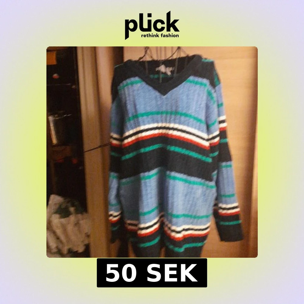 Säljer en oversized stickad tröja från H&M med breda ränder i blått, svart, grönt, vitt och rött. Tröjan har v-ringning och långa ärmar, perfekt för dig som gillar färg och vill ha en chill vibe. Passar dig som vill ha en mysig och trendig look.