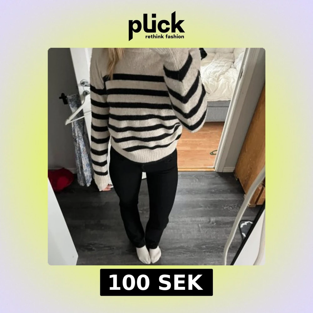 Säljer en mysig stickad tröja från H&M i beige med svarta ränder. Tröjan är i storlek xs🤗
