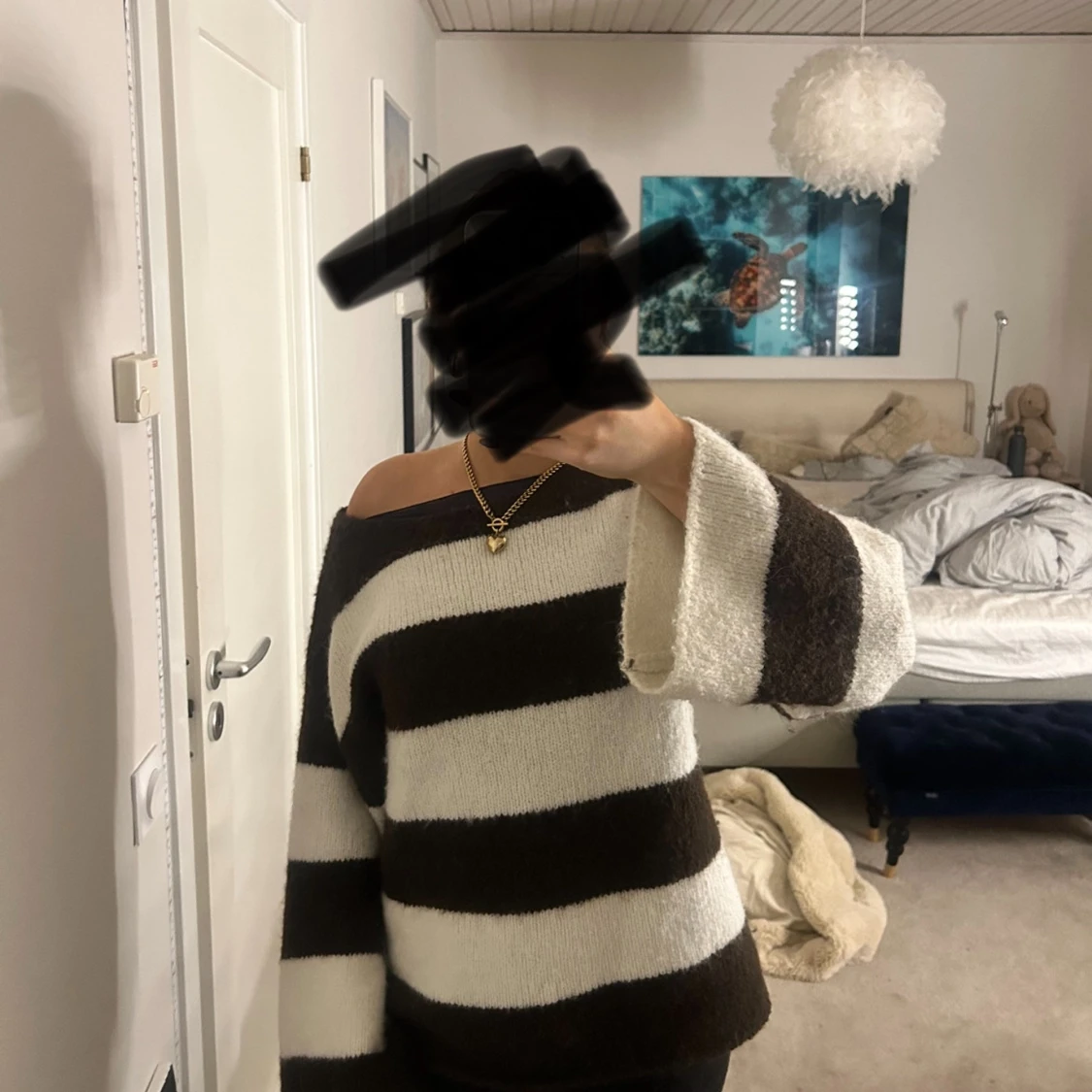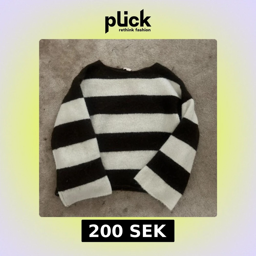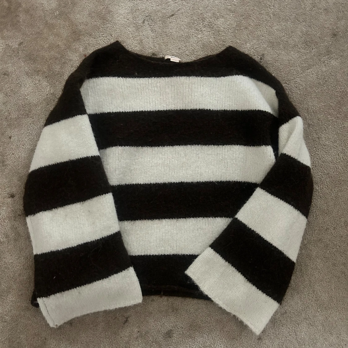 Mysig stickad tröja med breda bruna och vita ränder.