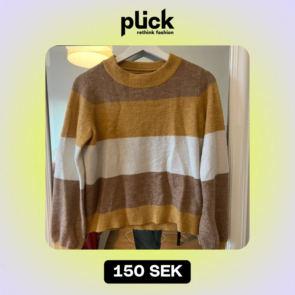 Mysig stickad tröja med breda ränder i brunt, gult och vitt. Perfekt för höst och vinter med sin varma och bekväma passform. Tröjan har långa ärmar och en rund halsringning.
