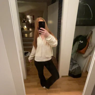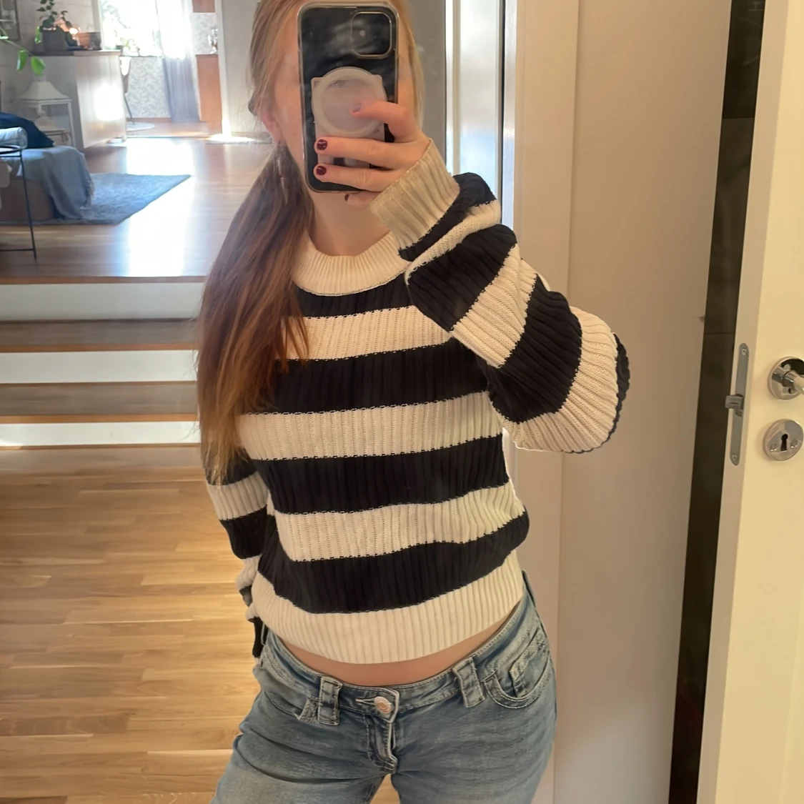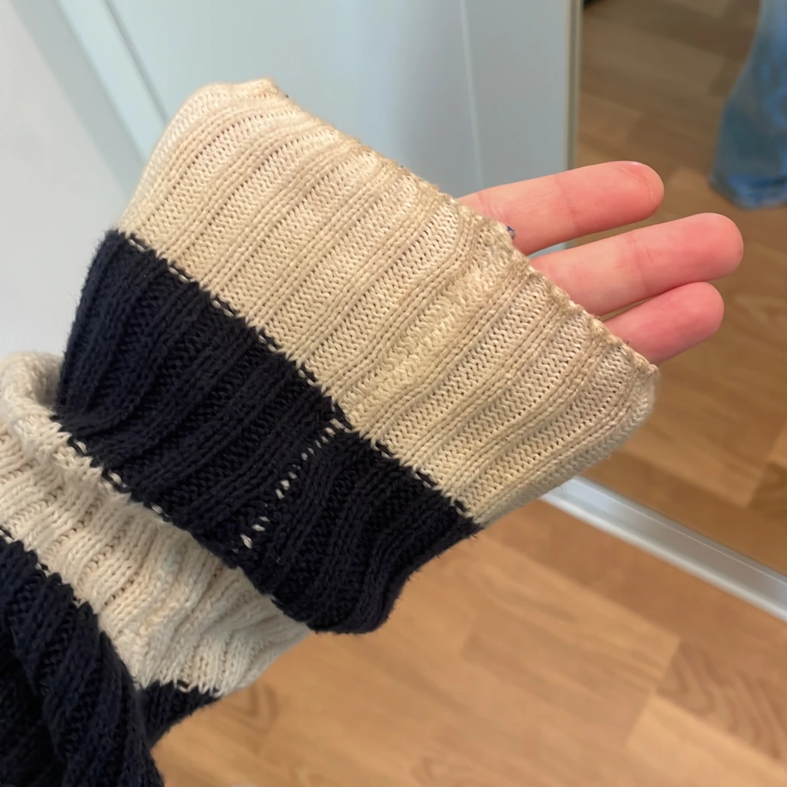Säljer en ribbstickad tröja med breda blåa och vita ränder. Tröjan har rund halsringning och långa ärmar. Den är mjuk och skön, perfekt för lager-på-lager och chill dagar. Passformen är normal och materialet känns som bomull eller syntet. OBS, smuts vid ärmarna som inte går bort.