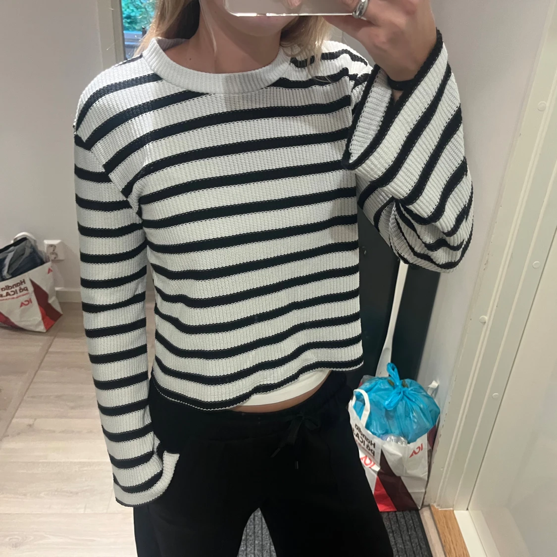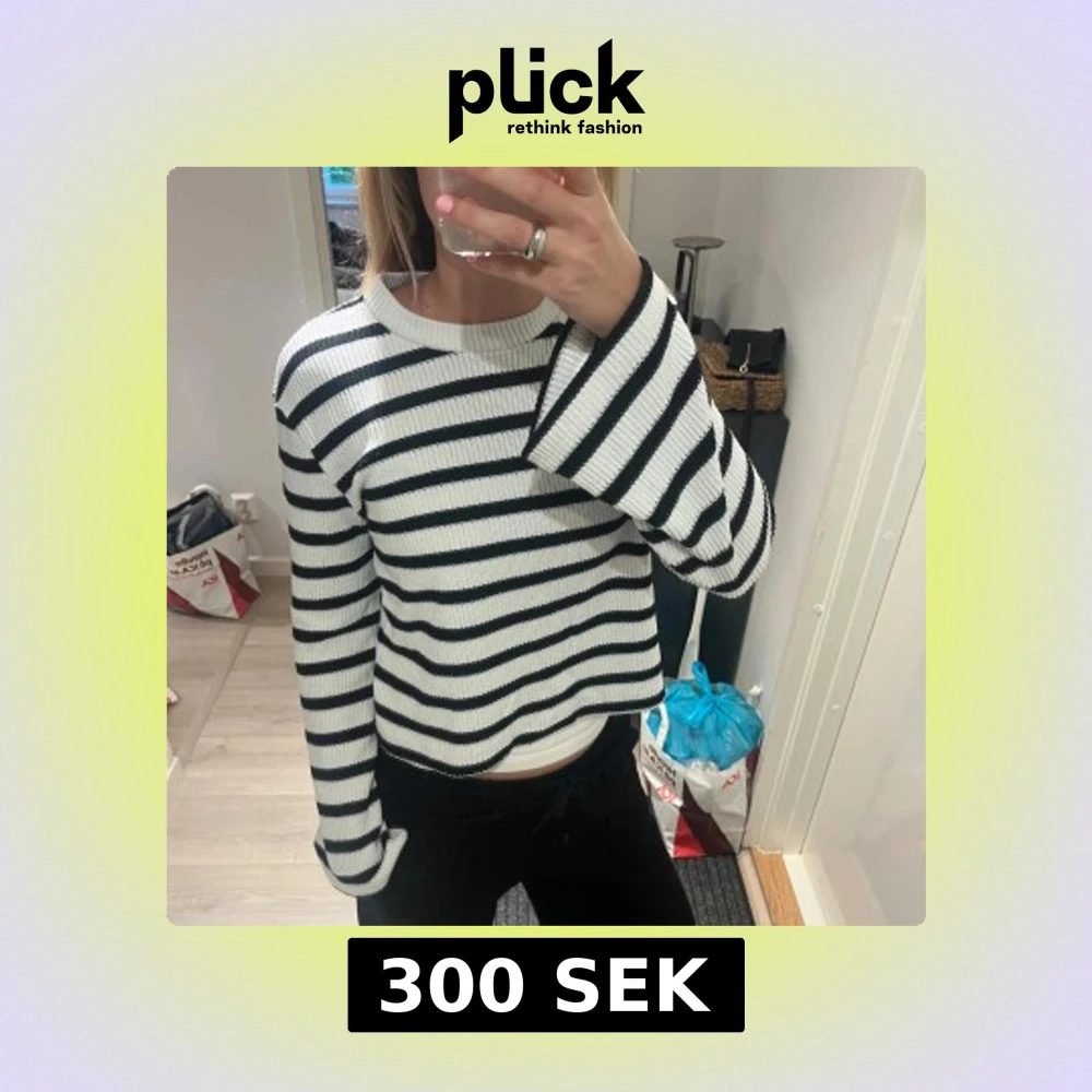 Säljer en stickad tröja med svarta och vita ränder. Tröjan har lång ärm, rund halsringning och en lite lösare passform. Perfekt för dig som gillar en chill och stilren look. Passar både till jeans och mjukisbyxor.
