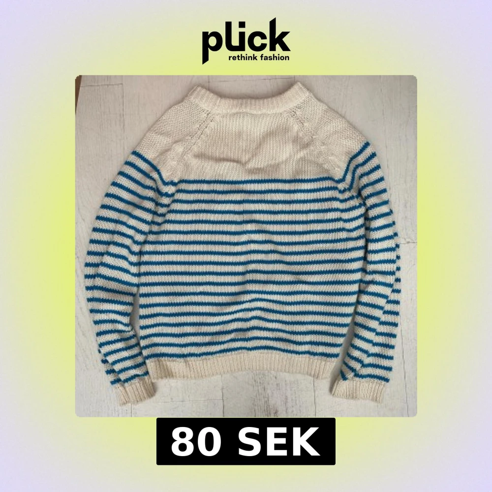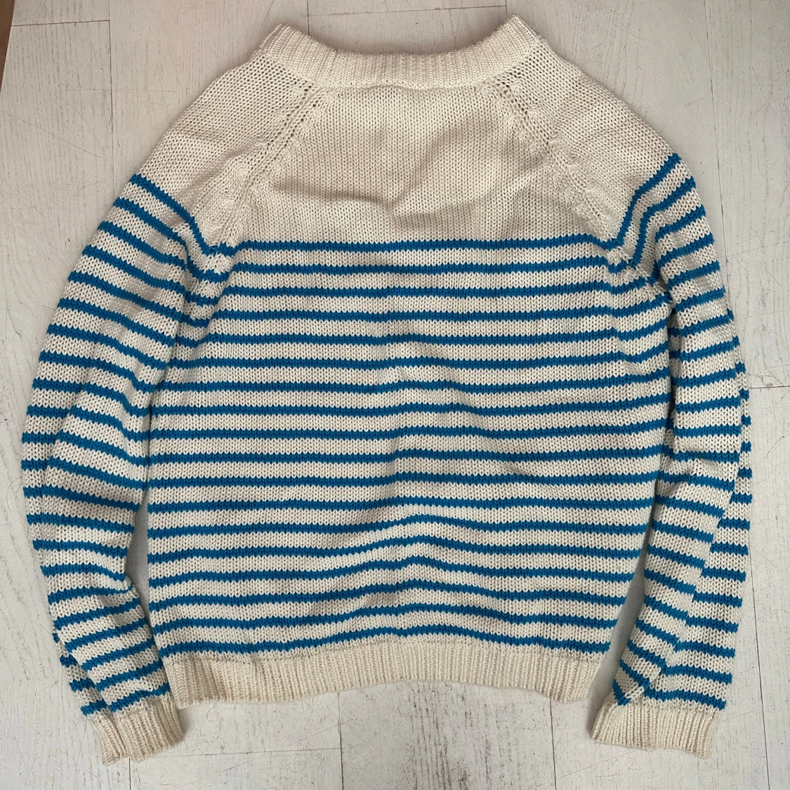 Säljer en mysig stickad tröja med vita och blå ränder. Tröjan har lång ärm, och ribbade muddar!☺️