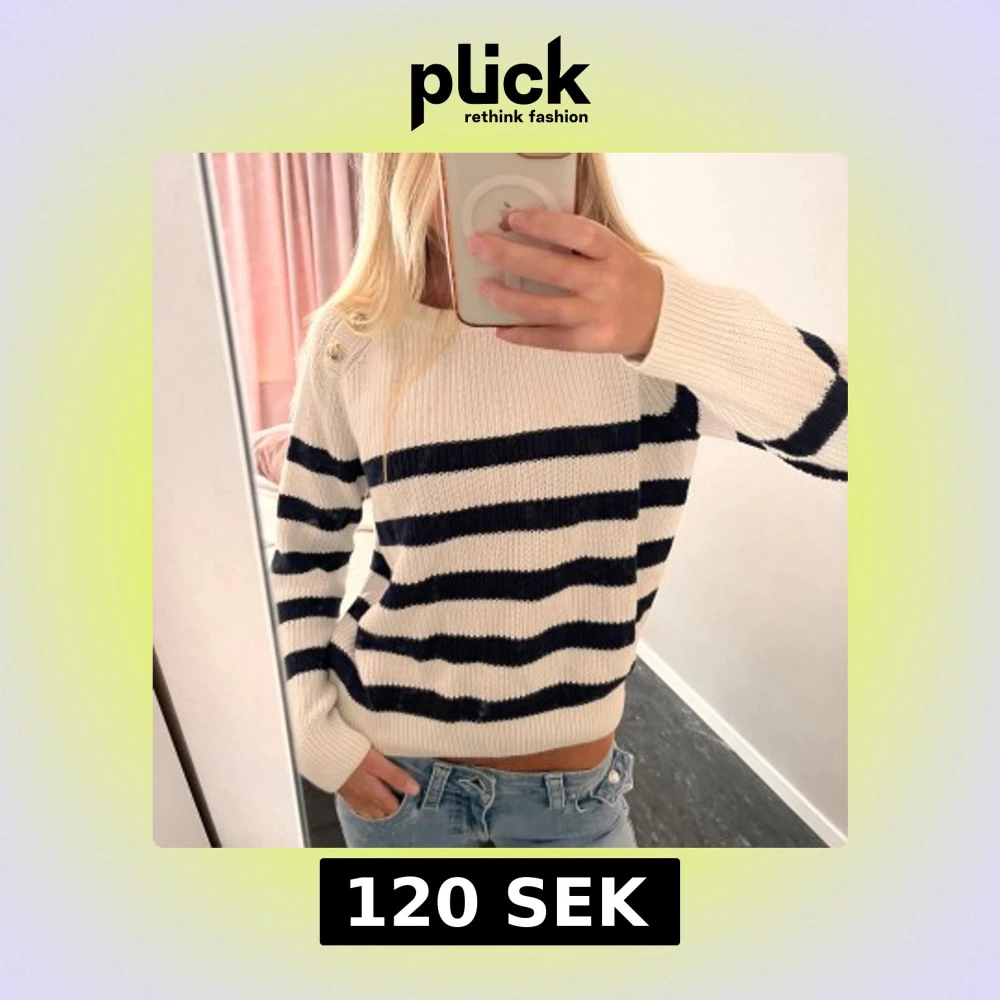Snygg stickad tröja i vitt och marinblått med breda ränder. Tröjan har guldknappar på axeln. Långärmad och i mjuk bomull, perfekt för en chill och stilren look. 😊