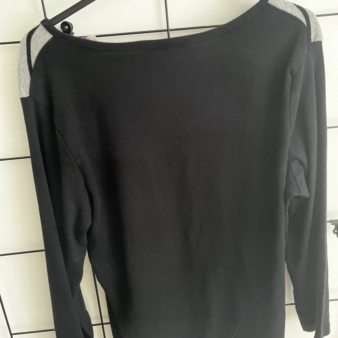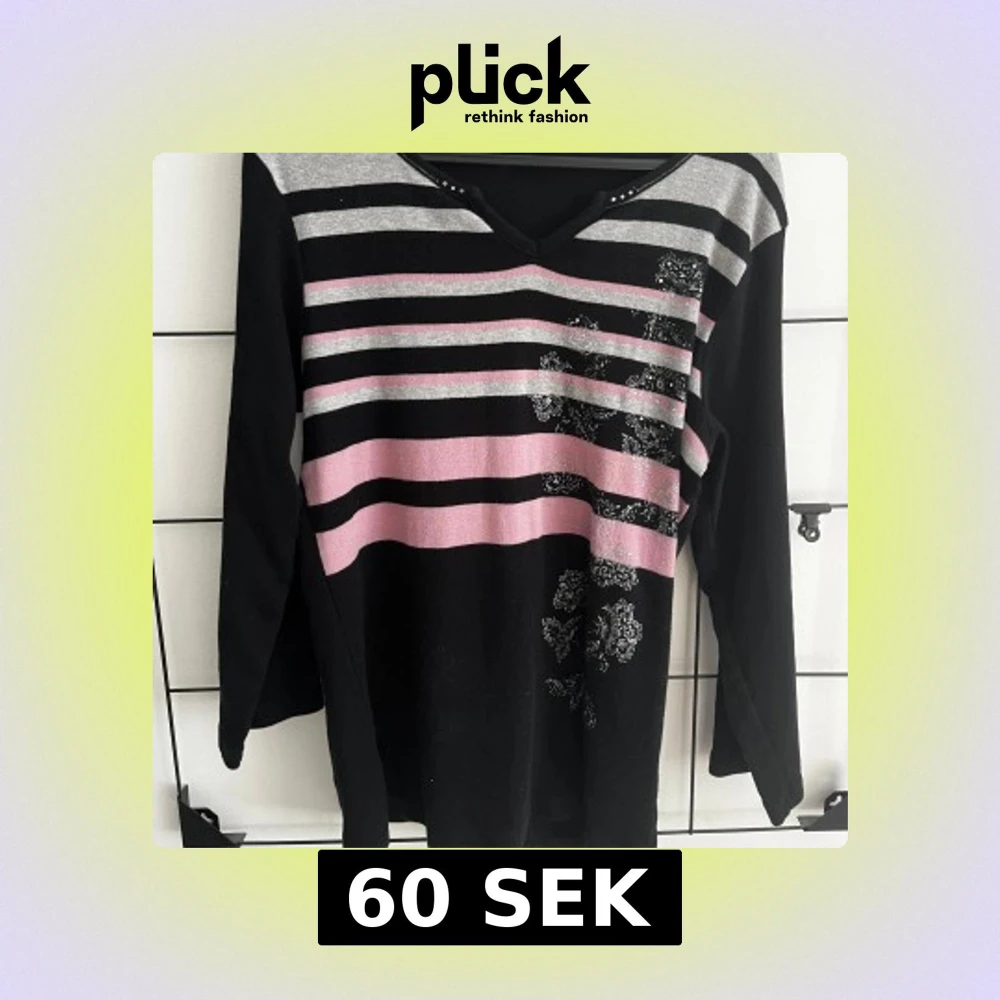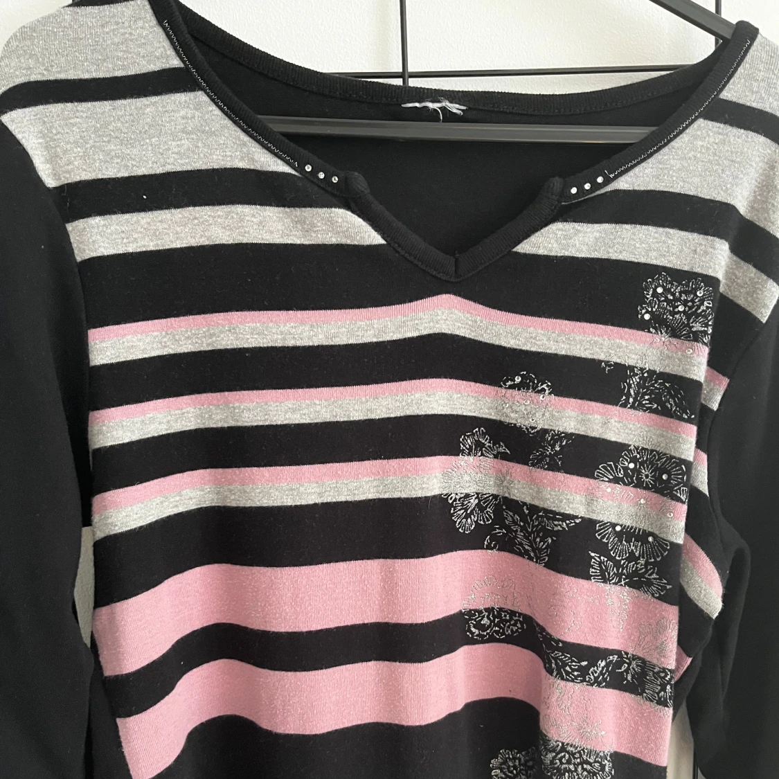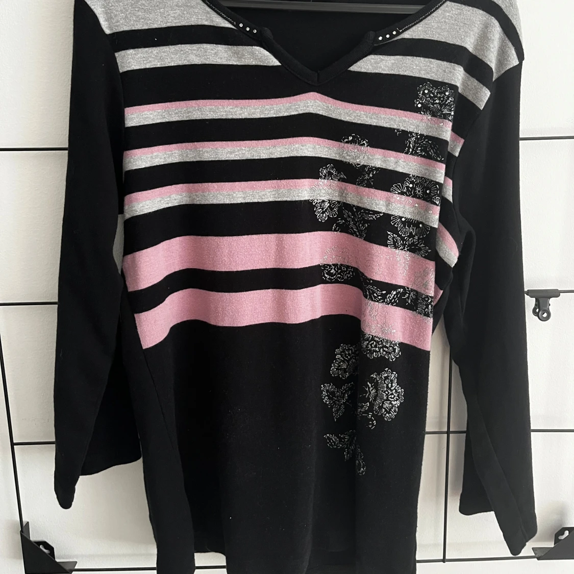 Svart långärmad tröja med v-ringning och små nitar vid halsen. Framsidan har grå och rosa ränder samt blommiga detaljer i silver. Tröjan har en mjuk känsla och är perfekt för dig som gillar en stilren men ändå lekfull look. Köpt på Vinted. Storlek M