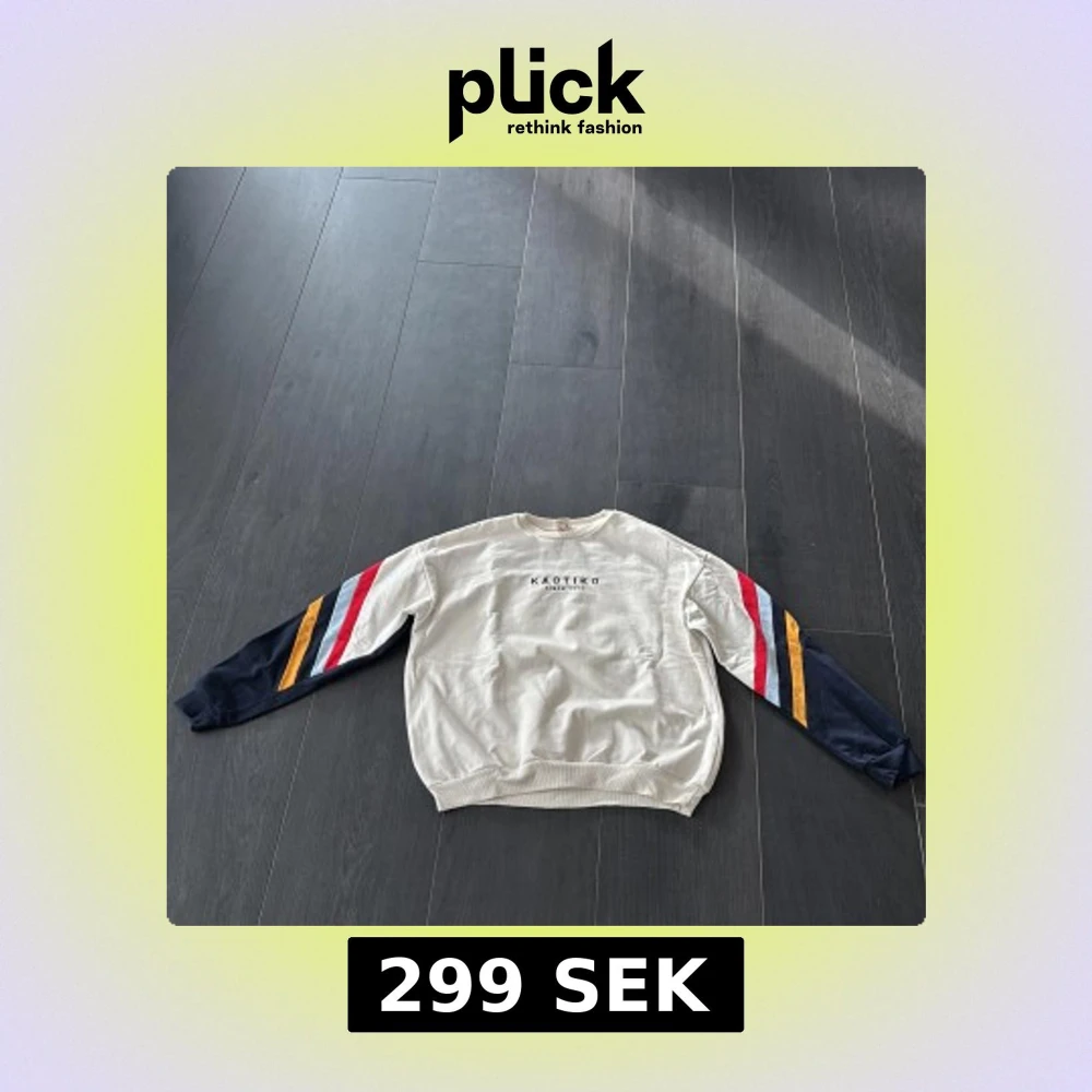 Snygg sweatshirt från Kaotiko i storlek M. Tröjan är cremevit med långa ärmar i marinblått, dekorerade med röda, ljusblå och gula ränder. Rund hals och ribbade muddar. Perfekt för dig som gillar streetwear och färgglada detaljer.