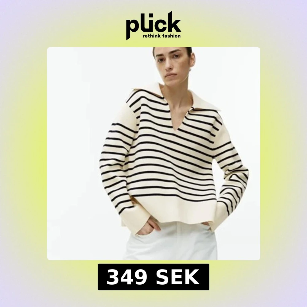Snygg stickad tröja i vitt med svarta ränder och bred krage. Tröjan har v-ringning och långa ärmar. Passformen är lite loose och materialet känns mjukt och bekvämt.