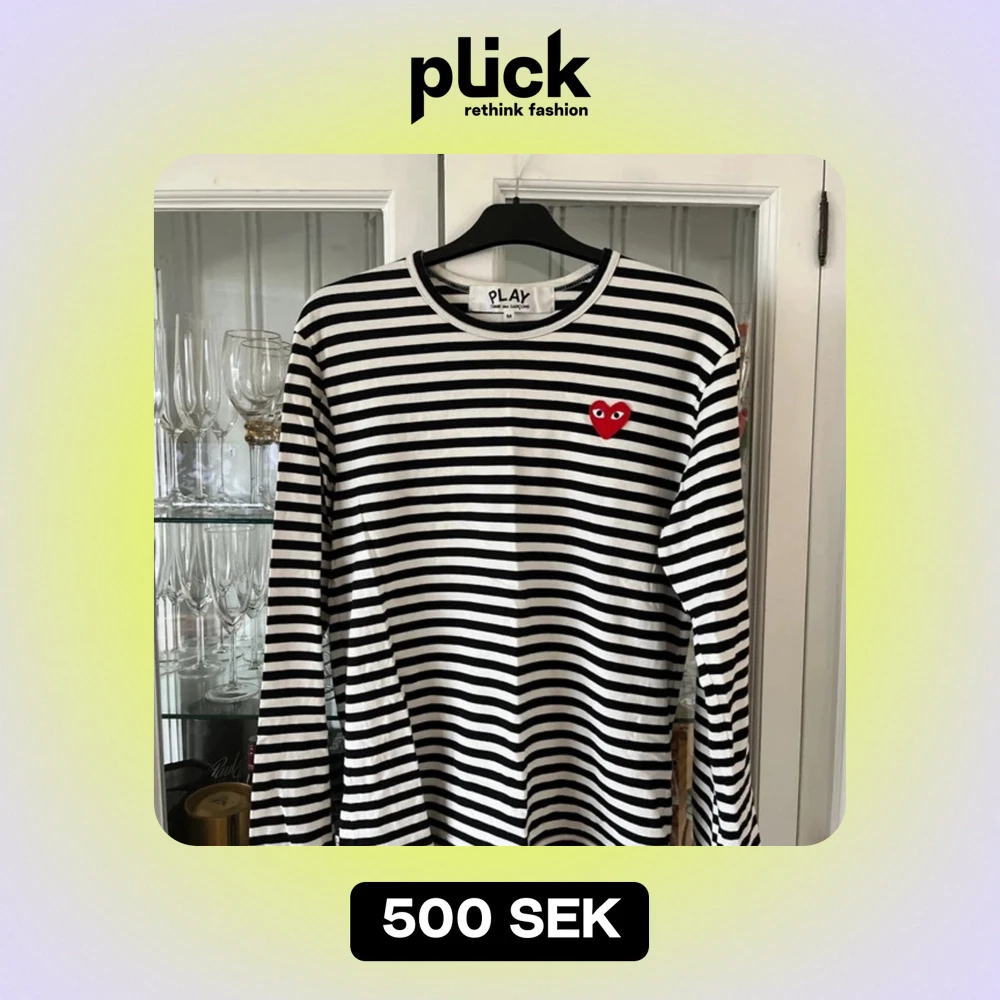 Säljer en superfin randig tröja från Comme des Garçons i svart och vit. Den har ett ikoniskt rött hjärta på bröstet. Perfekt för både vardag och fest! Tröjan är i mycket bra skick och har långa ärmar. Passar perfekt till jeans eller kjol.