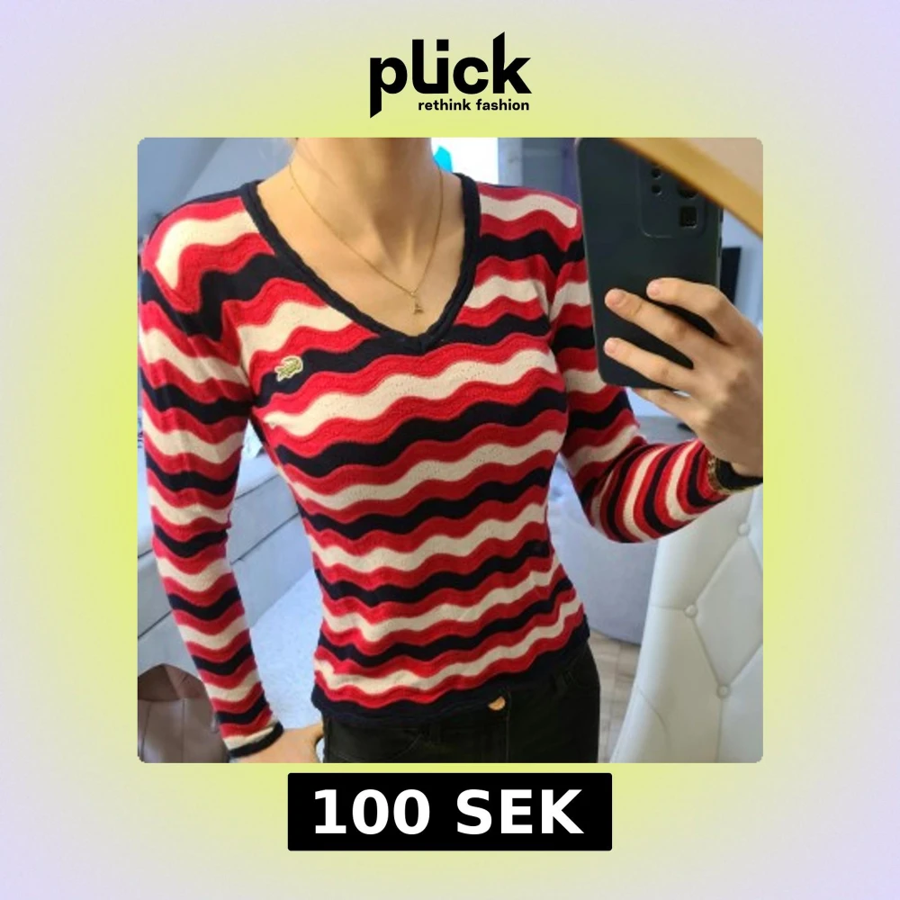 Säljer en snygg randig tröja från Lacoste i rött, vitt och blått. Tröjan har en v-ringad hals och långa ärmar, perfekt för en stilren look. Den är tillverkad i ett mjukt material som känns skönt mot huden.