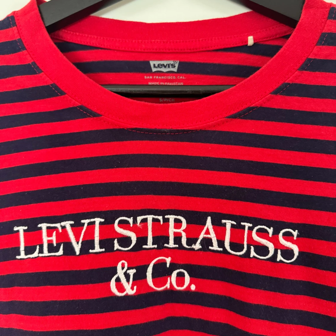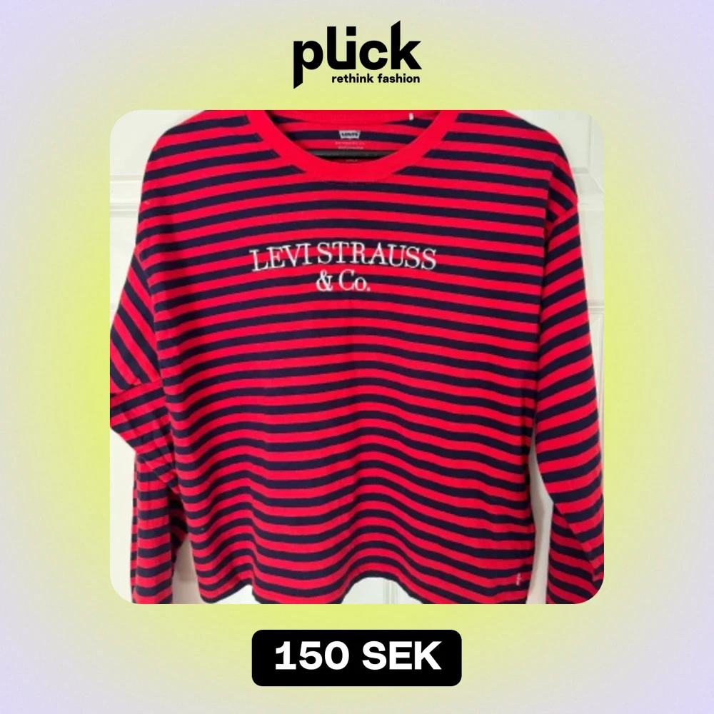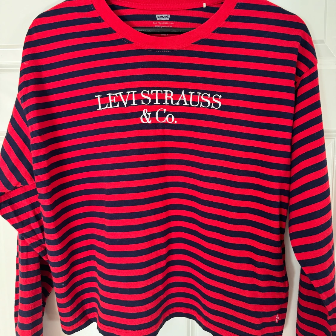 Tunn långärmad randig tröja från Levis. Röd och mörkblå, storlek S. Använd en gång, köpt för 600kr.