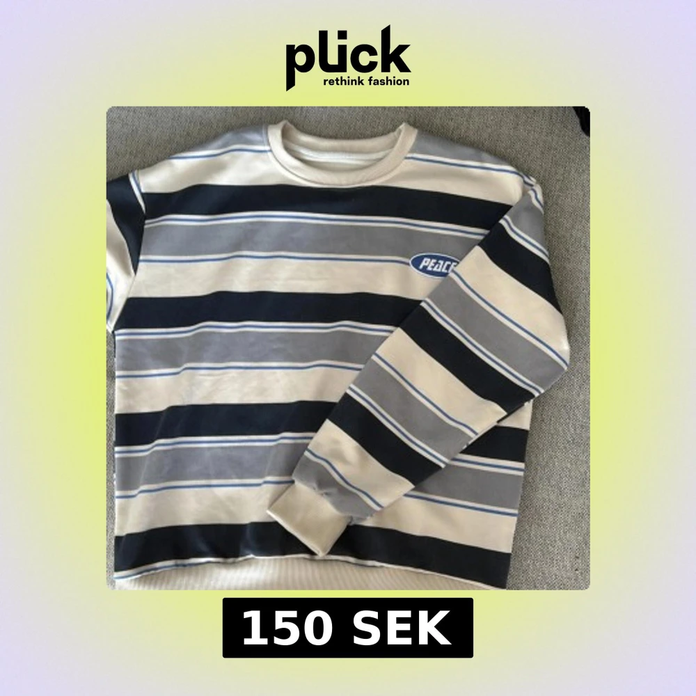 Säljer en snygg randig tröja från Peace i storlek M. Tröjan har ett coolt mönster med svarta, gråa, vita och blåa ränder. Den är långärmad och har en normal passform. Perfekt för höst och vår💕
