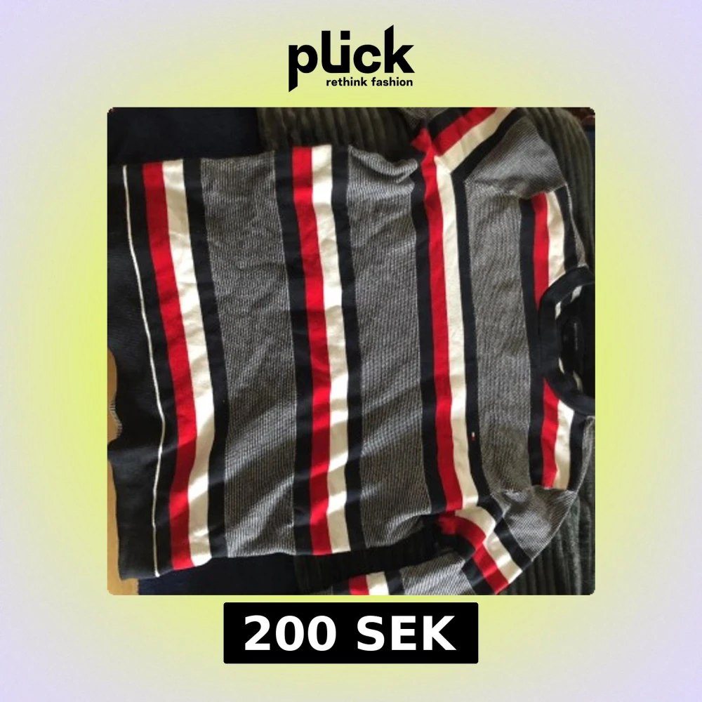Säljer en randig tröja från Tommy Hilfiger i svart, vit och röd. Tröjan har långa ärmar och ett klassiskt mönster med breda ränder. Tröjan har sönder vid ena armbågen och behöver sys samt vid kragen hänger det en textil bit