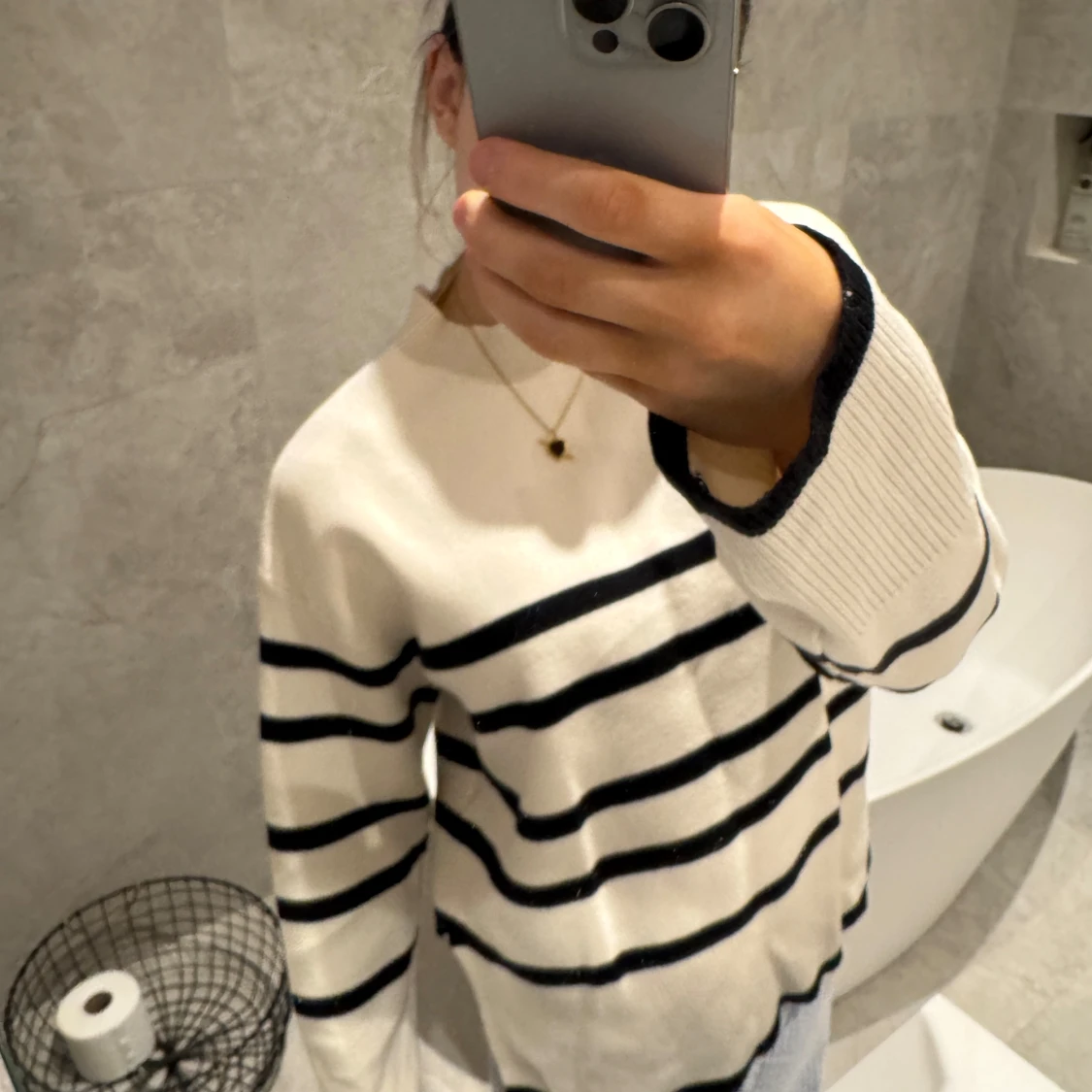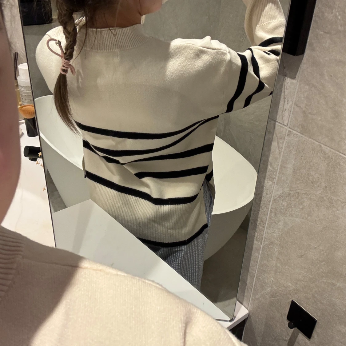 Säljer en snygg randig tröja från Vero Moda i beige och svart. Tröjan har långa ärmar och en bekväm passform med ribbad krage och ärmslut. Perfekt för en stilren look. Jätteskön och mysig tröja!!!