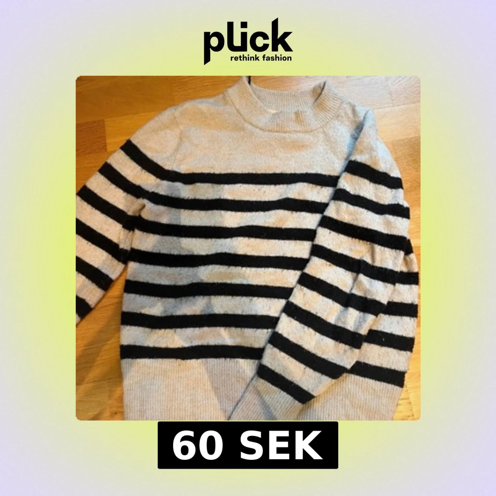 Säljer en snygg randig stickad tröja i beige och svart. Tröjan har långa ärmar och en bekväm passform. Perfekt för en stilren look. Lite nopprig annars bra skick !