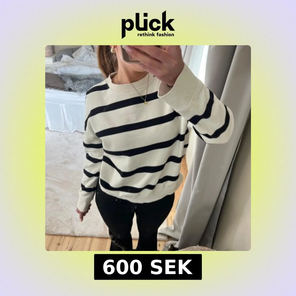 Säljer en stilren randig tröja i svart och vit. Tröjan har långa ärmar och en klassisk rund halsringning. Perfekt för en avslappnad look. 🖤🤍 köpt för 790