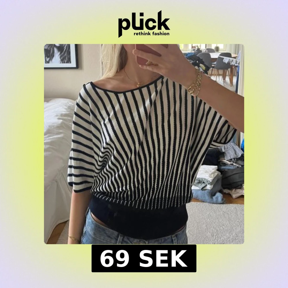 Snygg stickad tröja med svart och vit randigt mönster, bredare midjemudd, korta ärmar och i såå skönt material. Tröjan har en cool detalj med svarta knappar längs ena axeln och en avslappnad, loose passform.