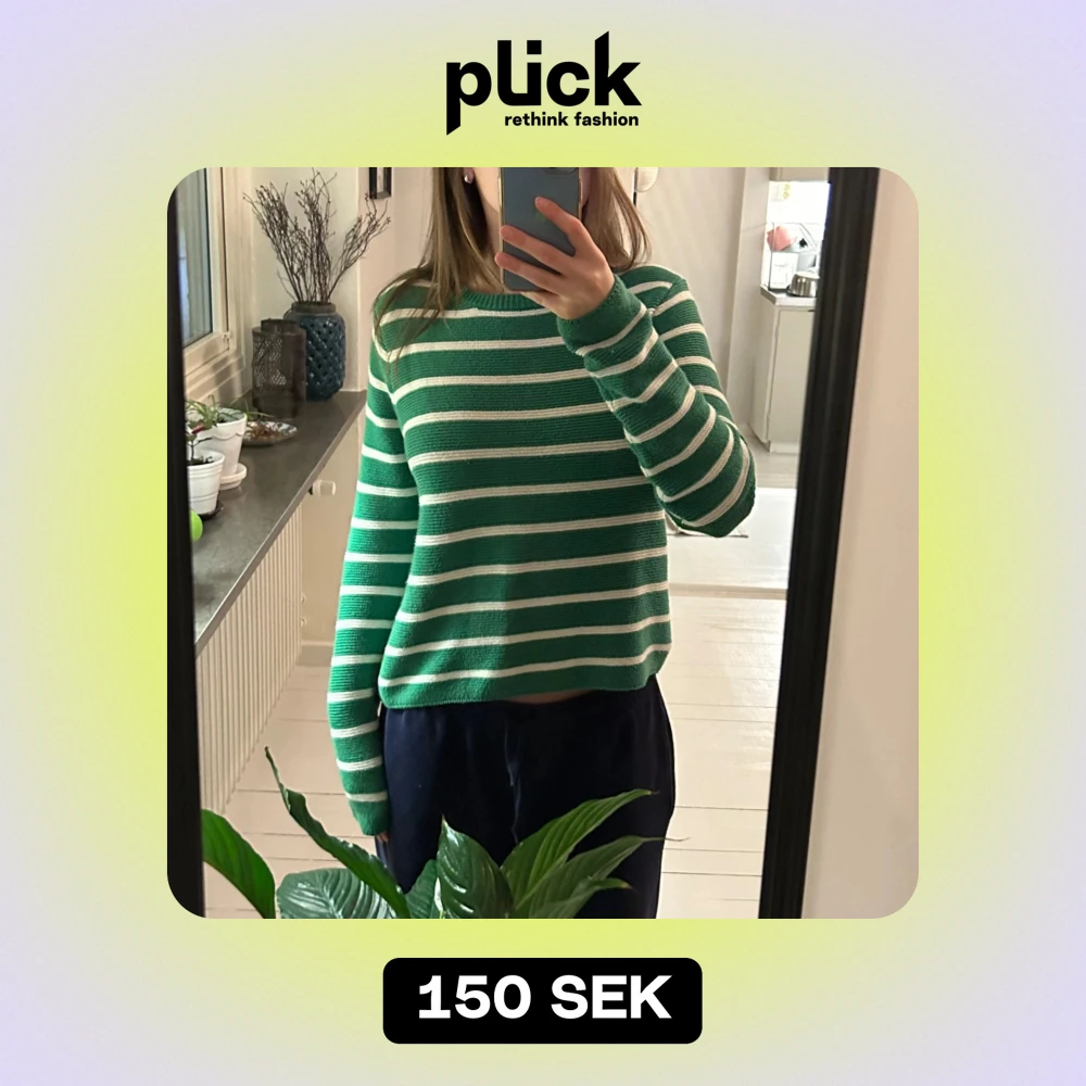 Grön stickad tröja med vita ränder i strl M från Mango. Använd men i fint skick