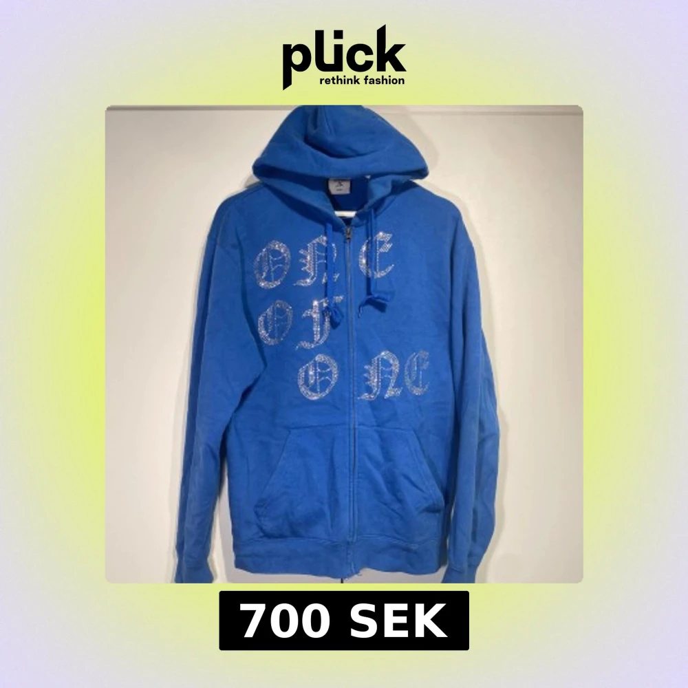 Blå zip hoodie från One of One med silver Rhinestones. Tröjan har huva med dragsko, hel dragkedja och känguruficka. Välanvänd men i okej skick. Unik och utstickande. Nypris 1500kr. Produceras ej längre. Skriv i dm för fler bilder.
