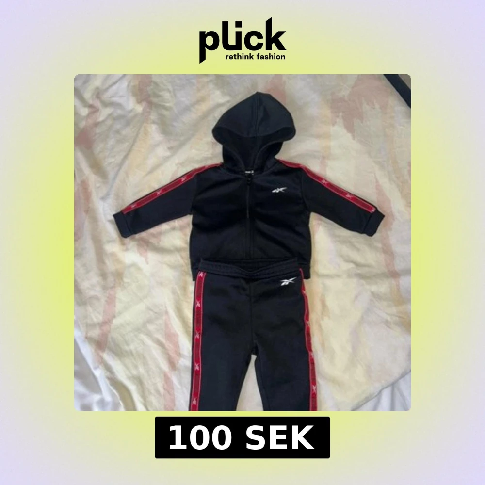 Säljer en svart hoodie från Reebok med röda detaljer längs ärmarna. Tröjan har en dragkedja framtill och en huva. Perfekt för en sportig look!
