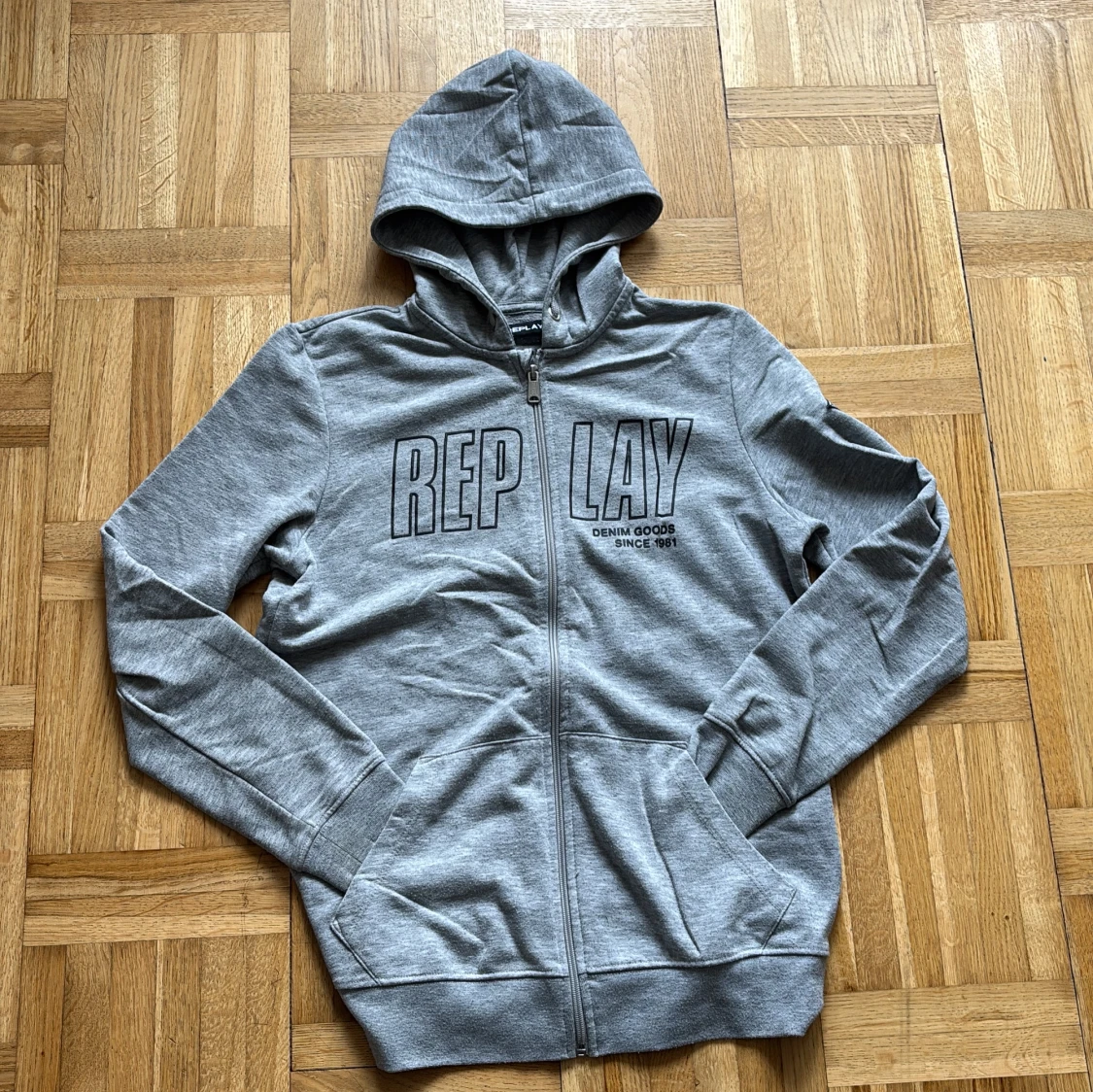 Snygg grå hoodie från Replay med dragkedja och huva. Stor logga framtill och Replay-märke på ärmen. Mjuk bomullsblandning, perfekt för chill dagar. Fickor framtill och ribbade muddar för extra komfort.