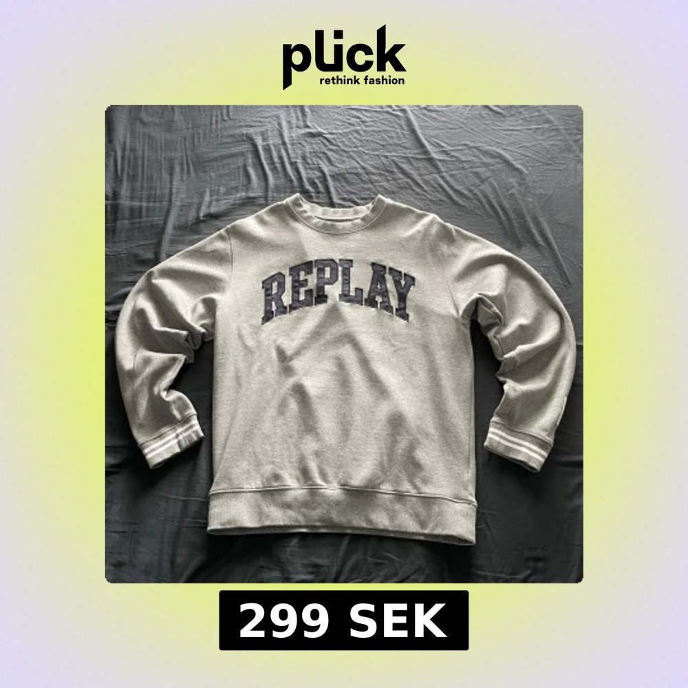 Säljer en grå sweatshirt från Replay med tryckt logga på bröstet och patch på ärmen. Tröjan har rund halsringning och ribbade muddar vid ärmslut och nederkant. Perfekt för en avslappnad stil.