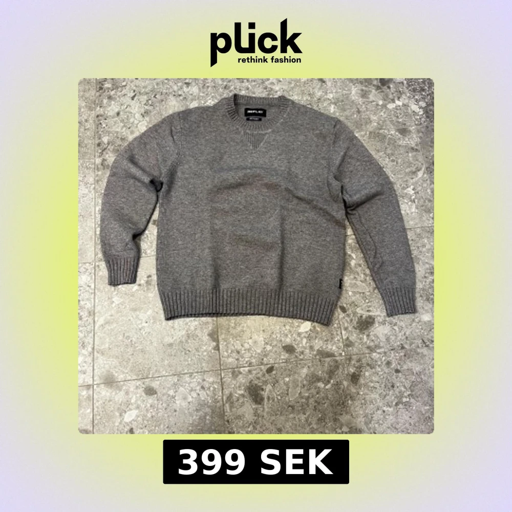 Säljer en stilren grå stickad tröja från Replay i storlek S. Perfekt för lager-på-lager och enkel att matcha med jeans och mera. Stl s